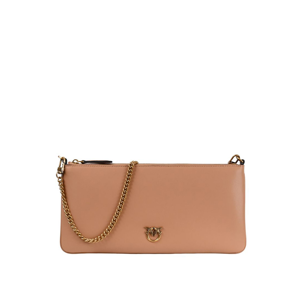 The Horizontal Flat bag by Pinko with a long line in soft leather. Personalization with Love Birds Diamond Cut placket, galvanic antique gold. Inner lined in polycotton and thin chain strap. Closure with zip.