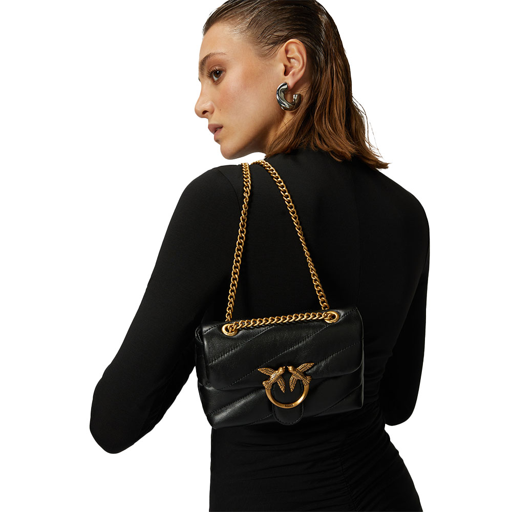 The Love Baby Puff bag by Pinko is a shoulder bag made of soft nappa with maxi diagonal quilting. The clasp is completed by the iconic Love Birds Diamond Cut metal buckle.