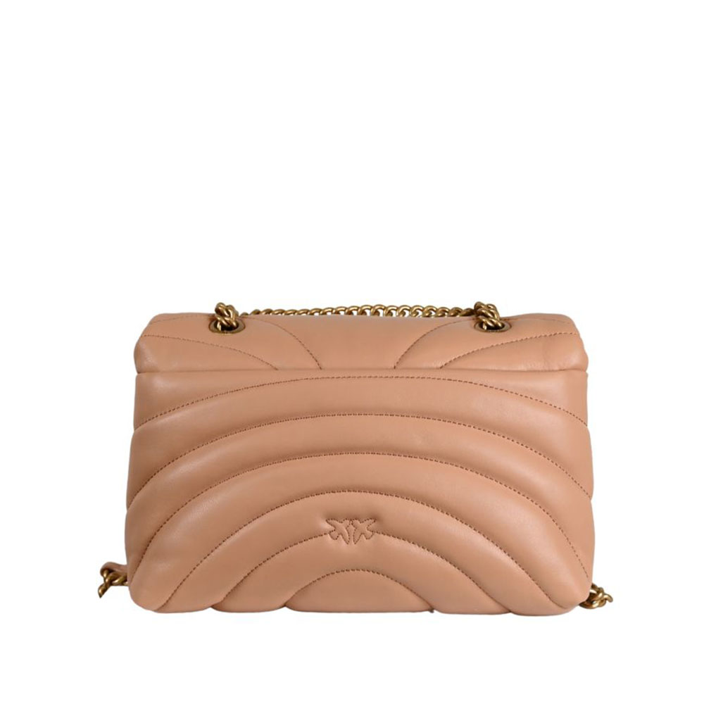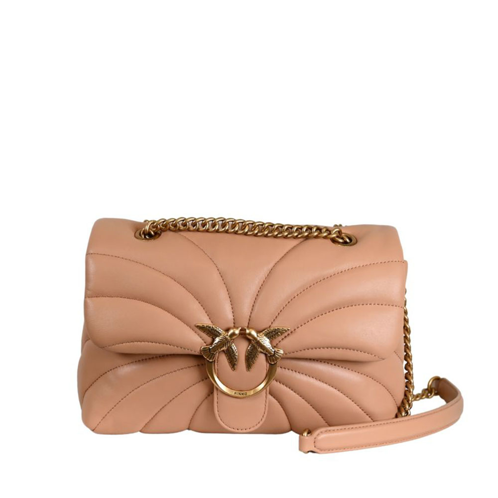 The large Love Bag Puff shoulder bag by Pinko is made of soft quilted nappa with butterfly motif. The closure of the bag is completed by the metal buckle, with Love Birds Diamond Cut logo. The sliding shoulder strap combines the classic metal chain with the practical nappa shoulder strap, and can be doubled to wear the shoulder bag.