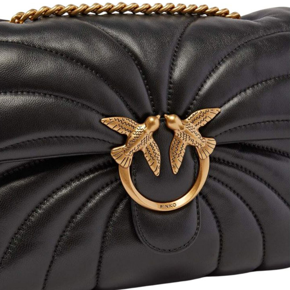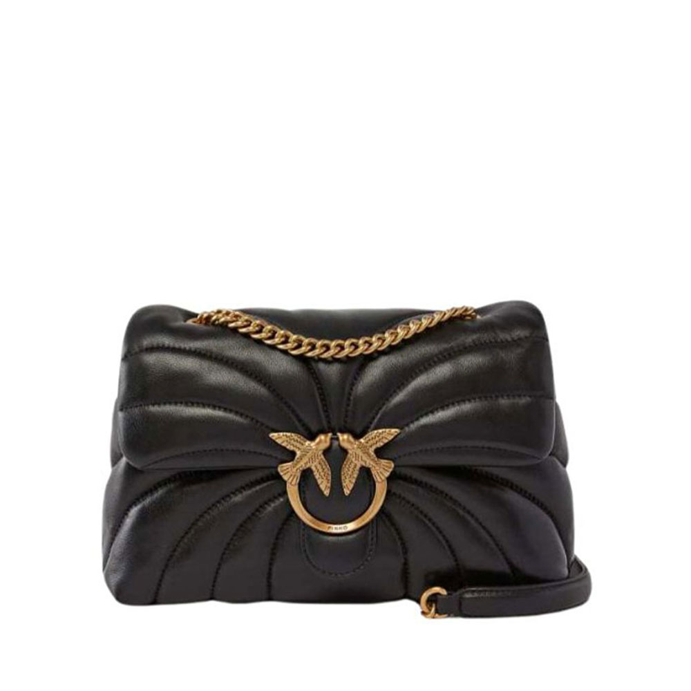 The large Love Bag Puff shoulder bag by Pinko is made of soft quilted nappa with butterfly motif. The closure of the bag is completed by the metal buckle, with Love Birds Diamond Cut logo. The sliding shoulder strap combines the classic metal chain with the practical nappa shoulder strap, and can be doubled to wear the shoulder bag.