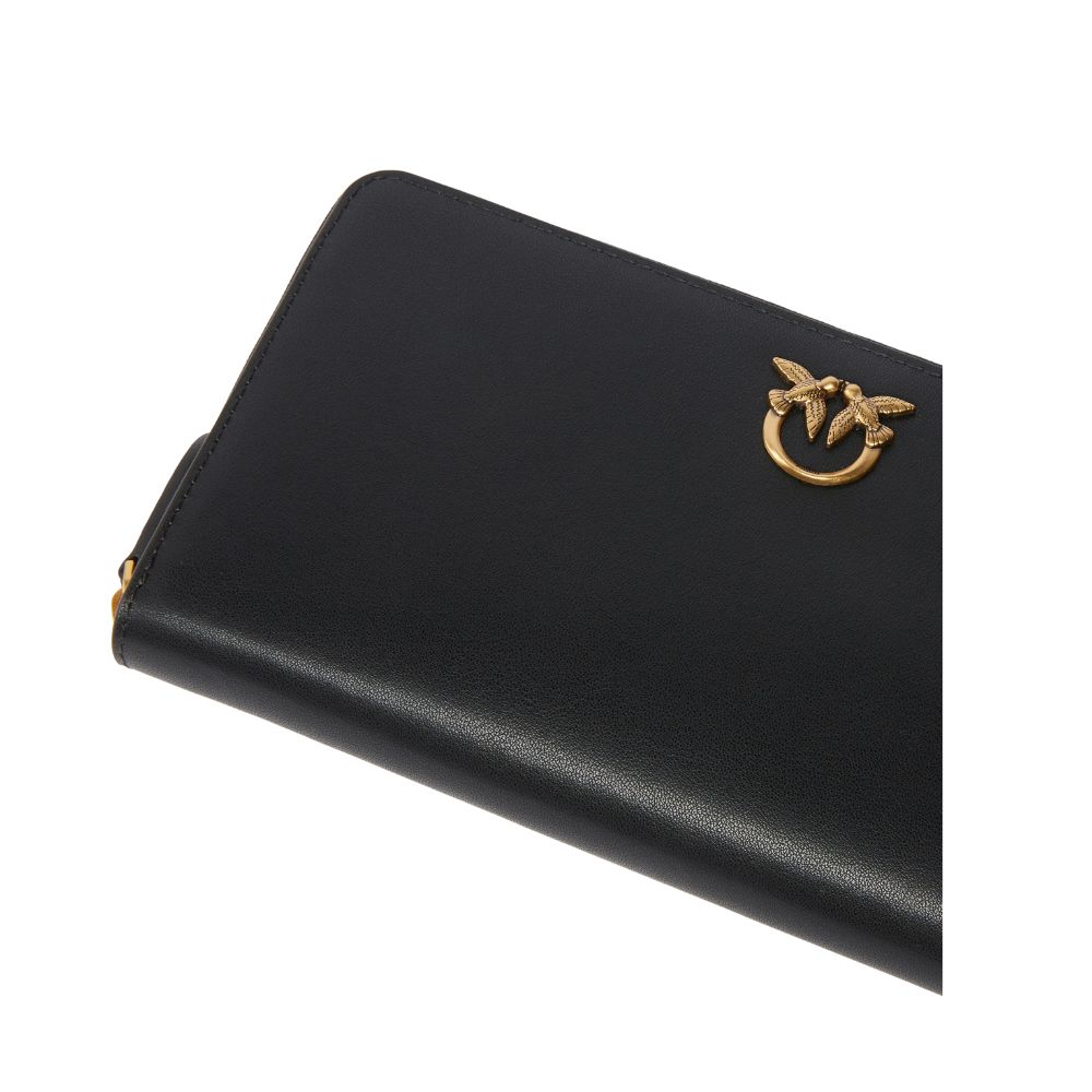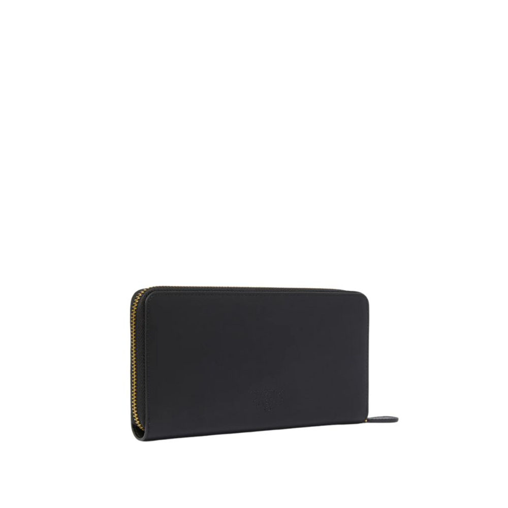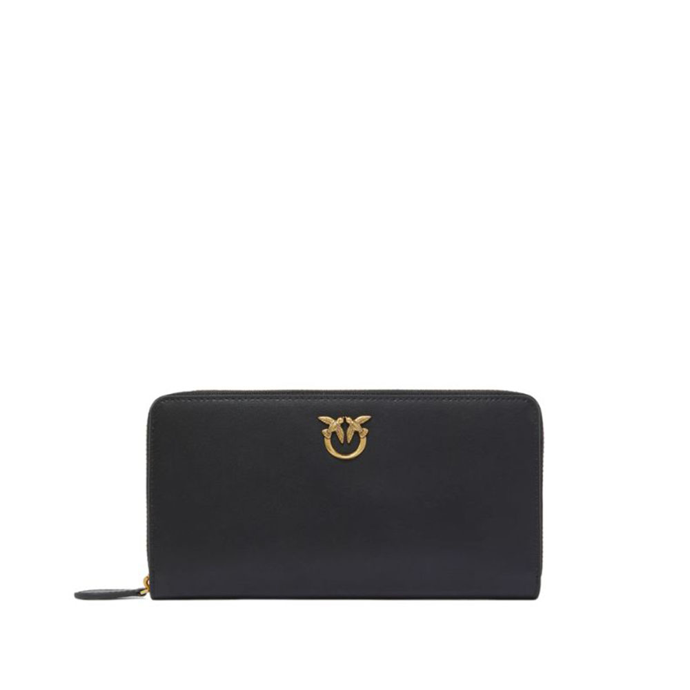 Pinko zip-around wallet in soft silky hand leather, personalized with Love Birds Diamond Cut plaque on leather base. The interior is lined with polycotton and is divided into four compartments, one of which is closed with a zip and two with credit card spaces.
