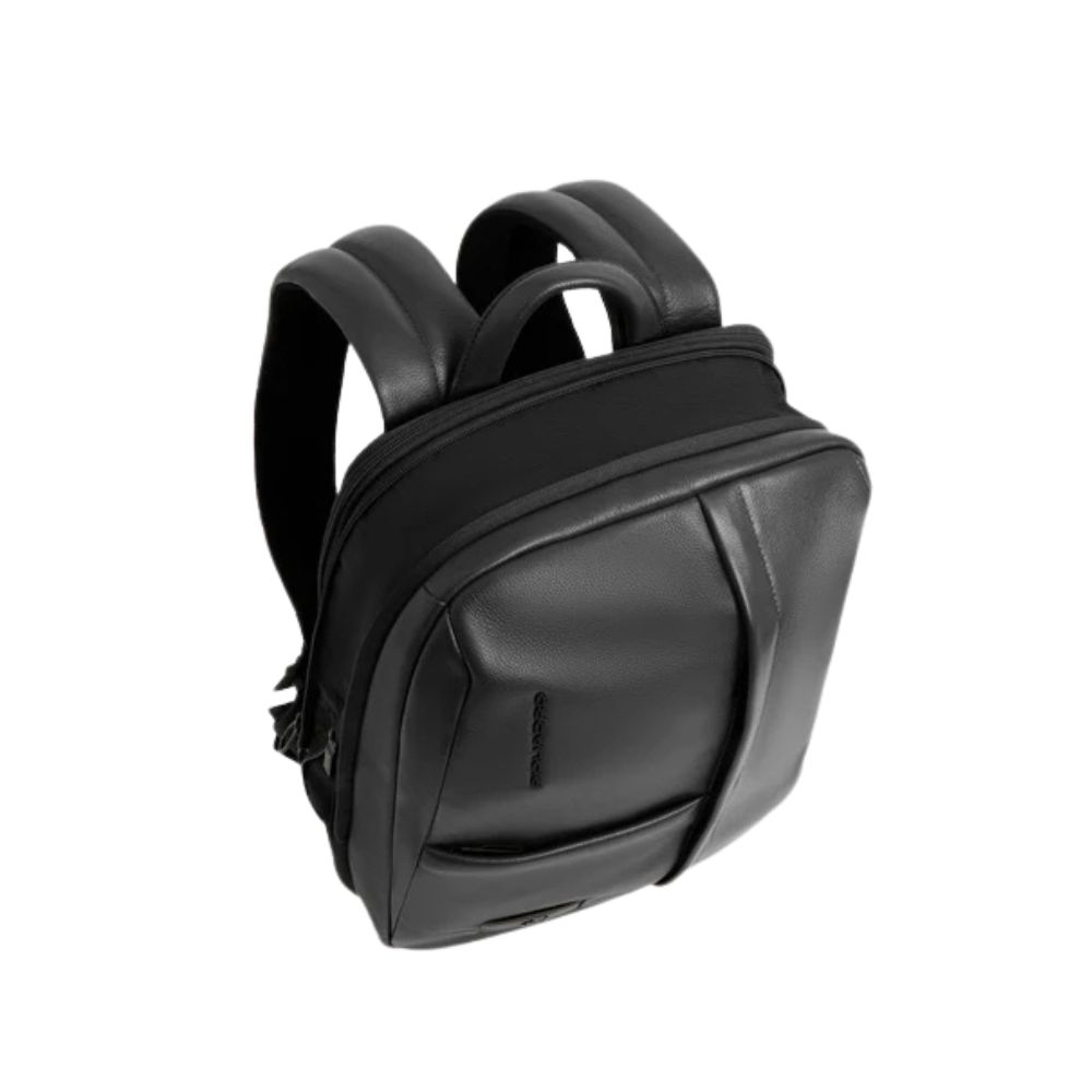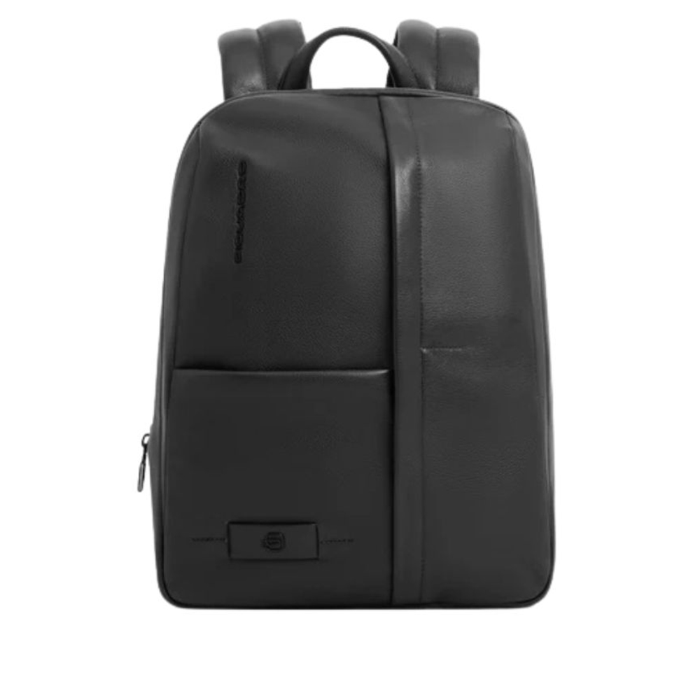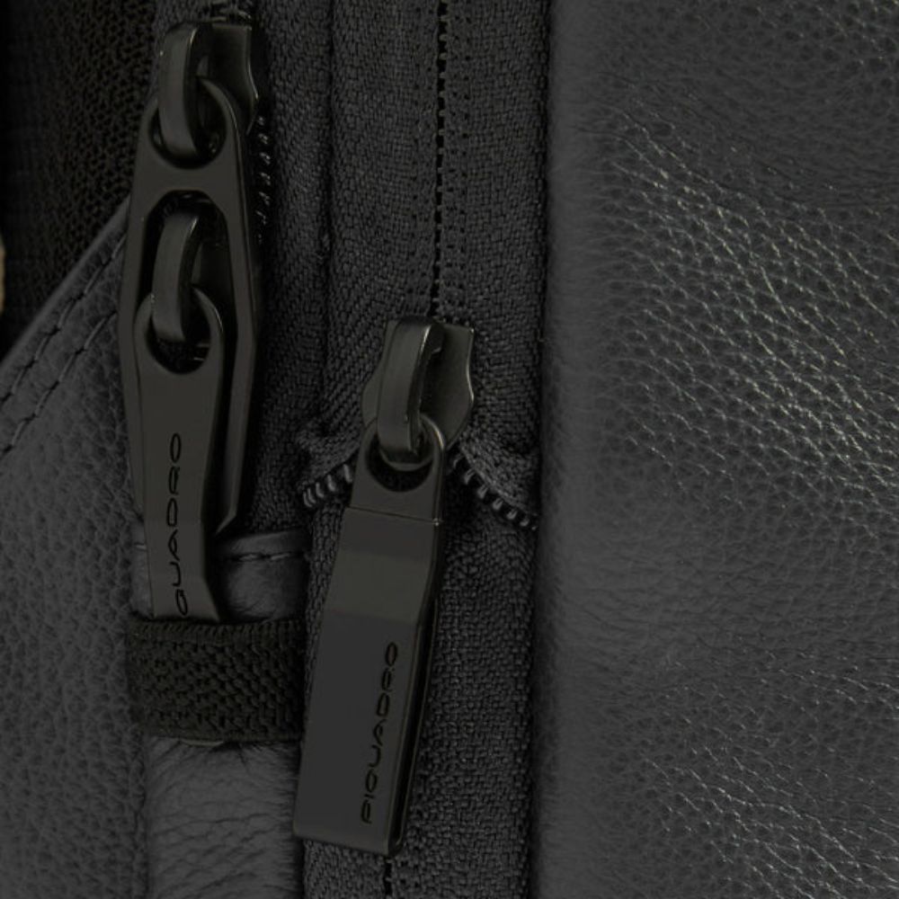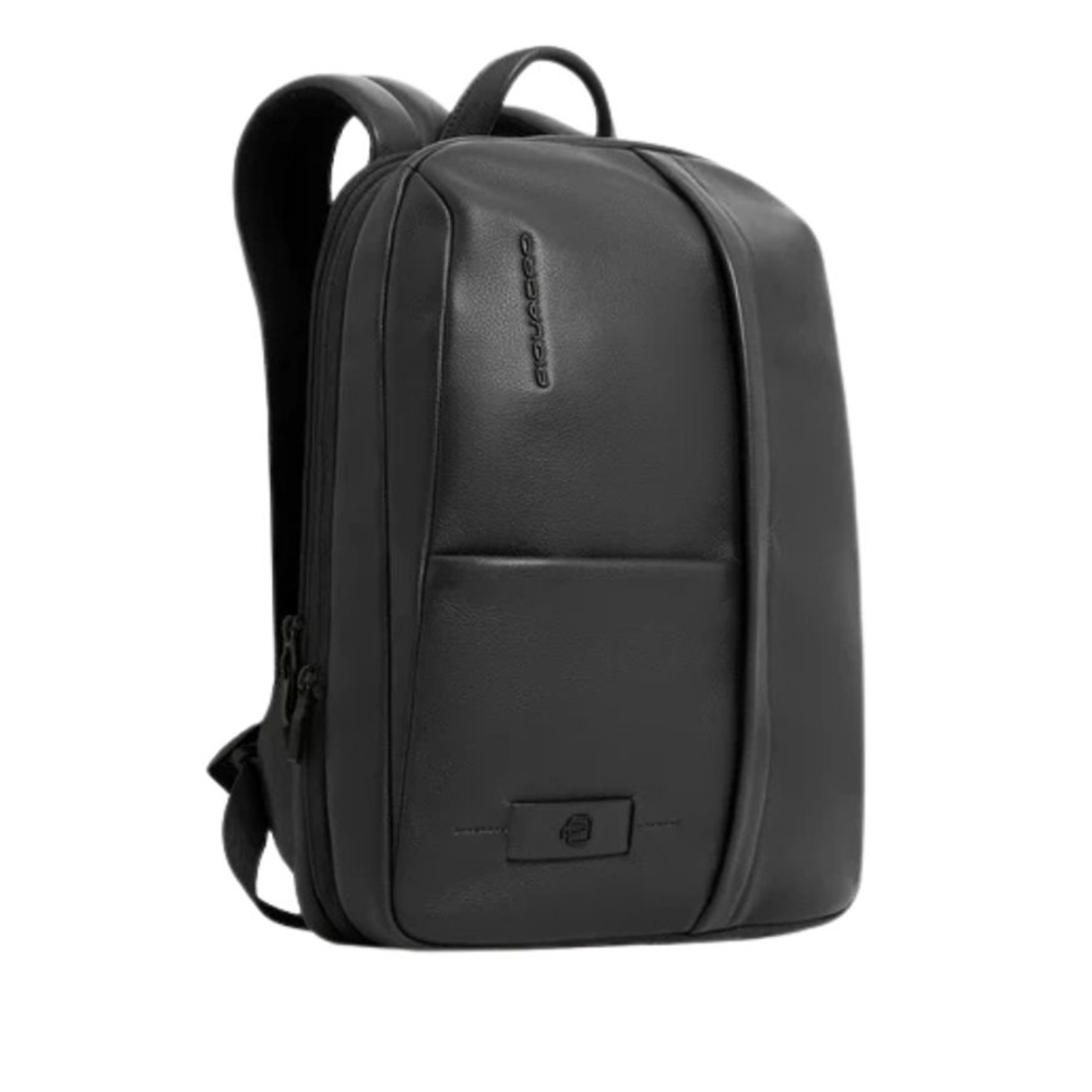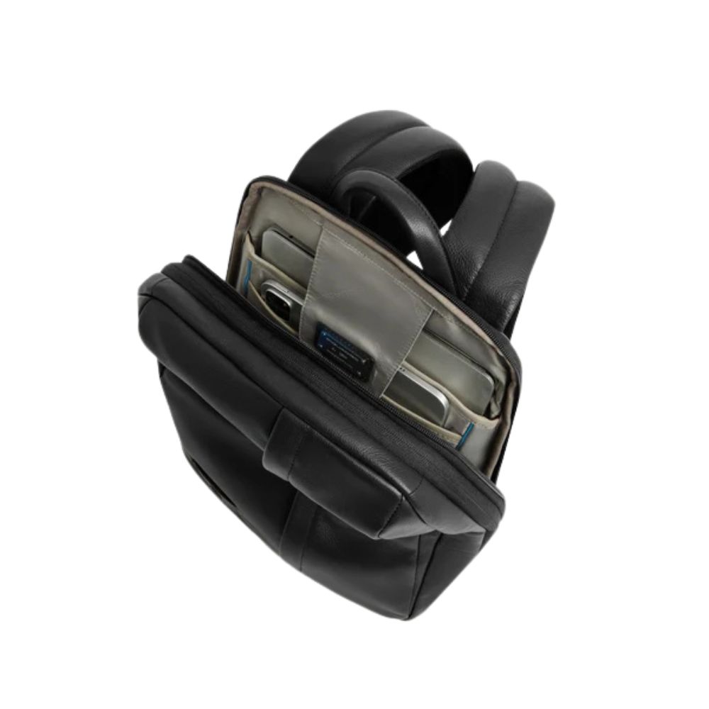 Expandable leather Piquadro laptop backpack with iPad compartment, security system, glasses holder, RFID protection and shockproof.