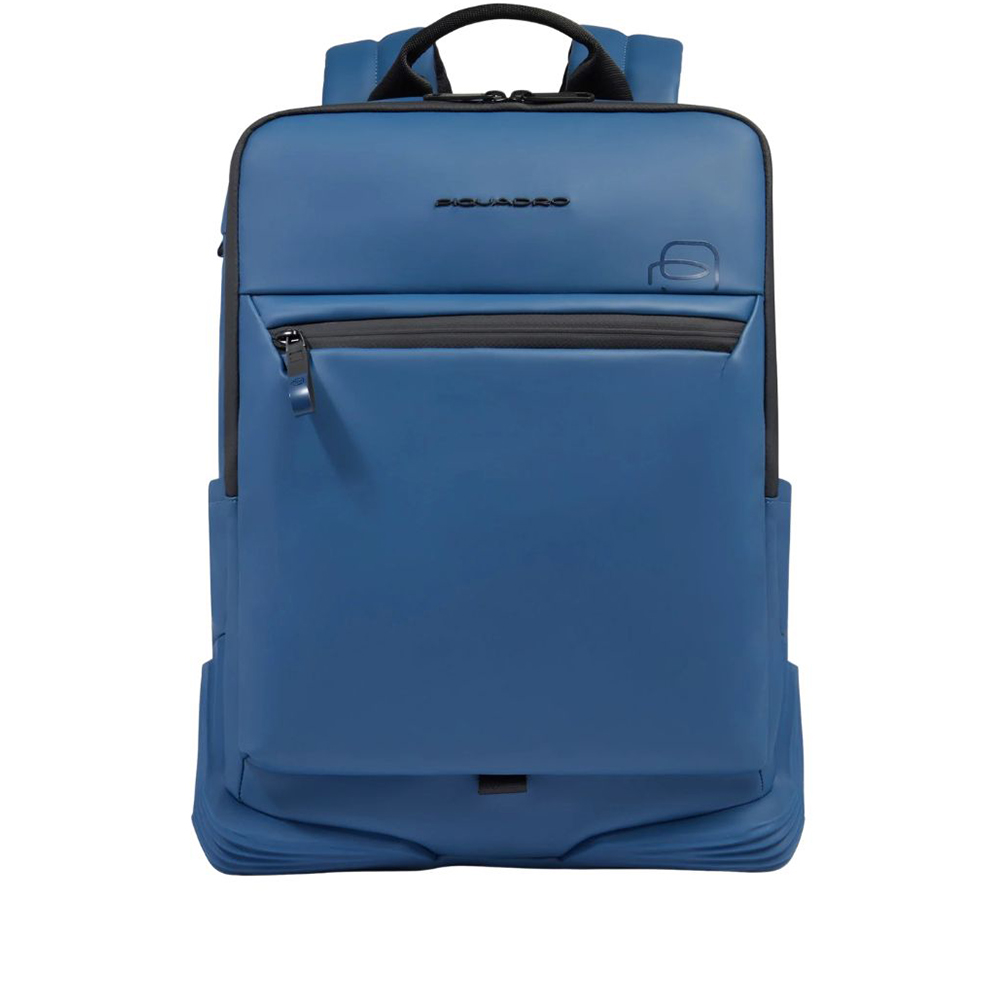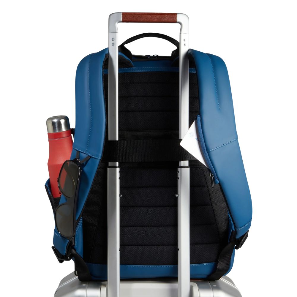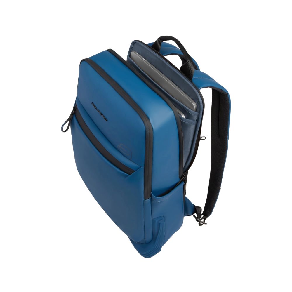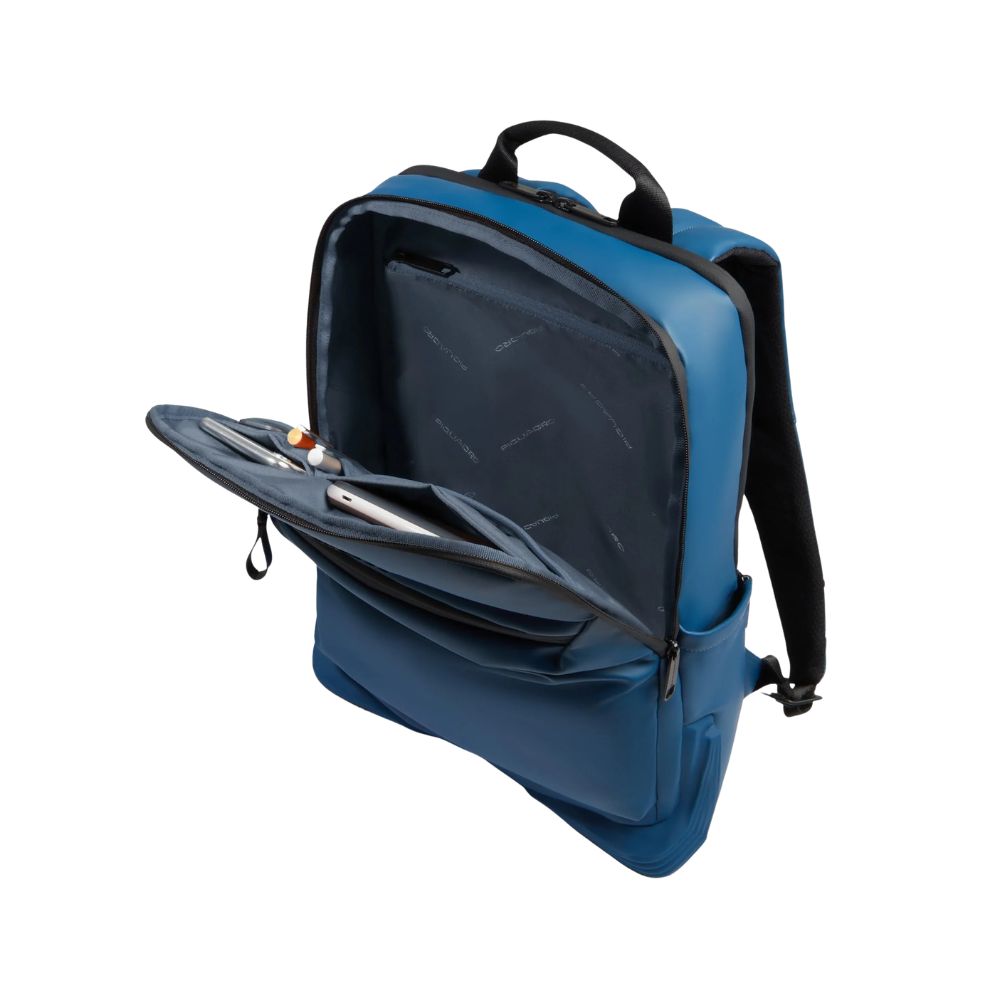 Backpack for pc and iPad by Piquadro in rubberized fabric, water resistant with impact protection, chest strap, bottle holder pocket and RFID protection.