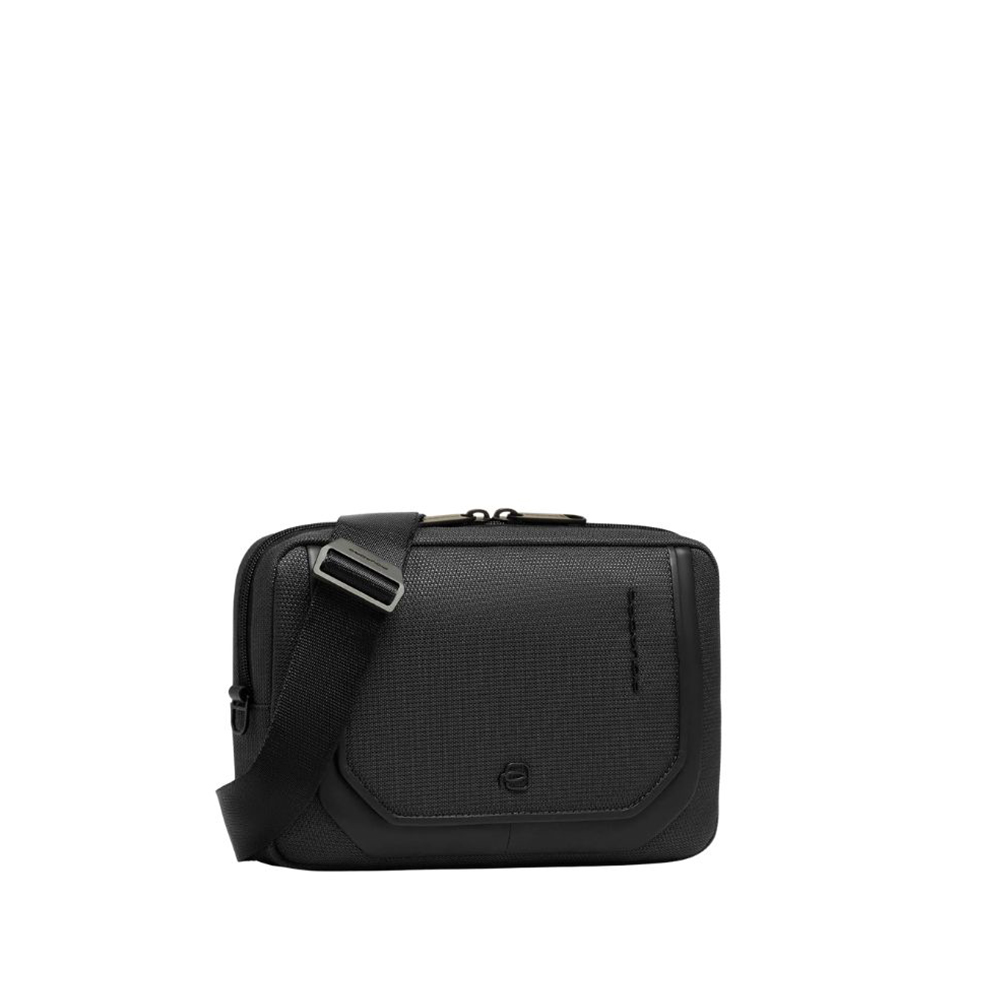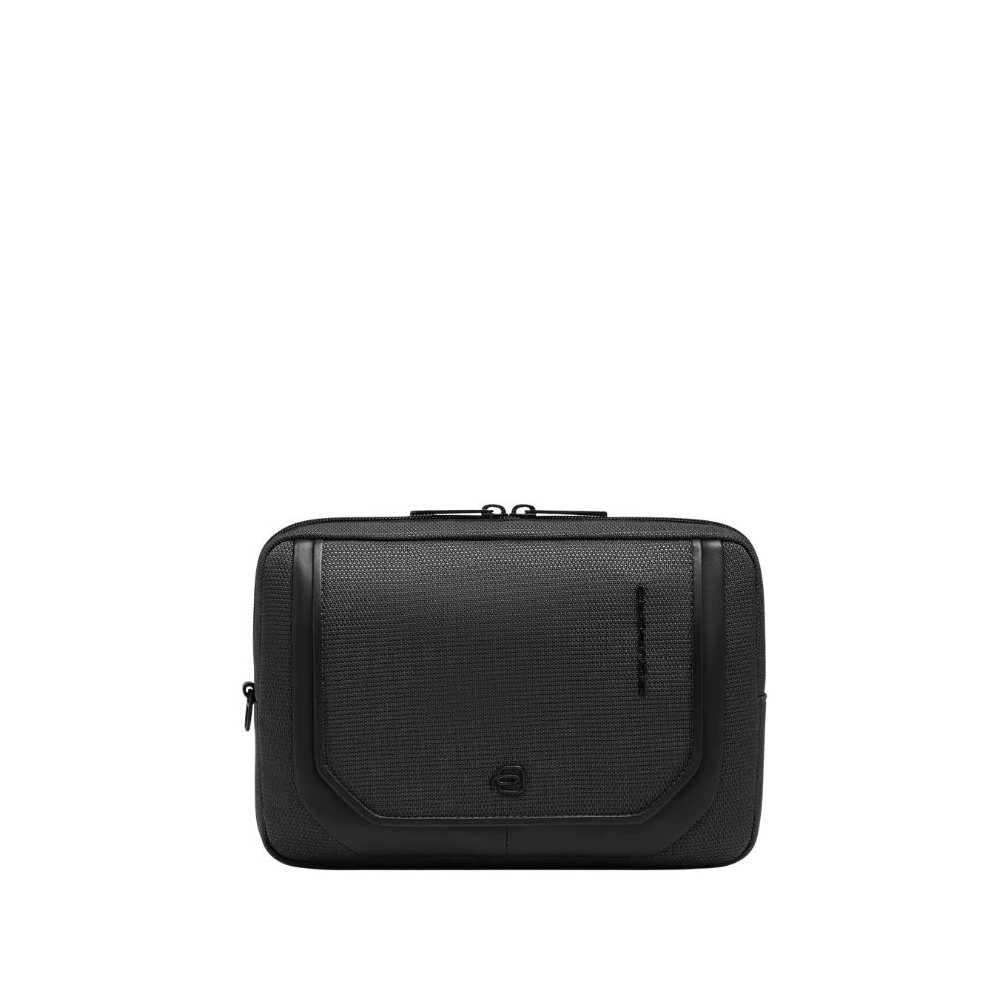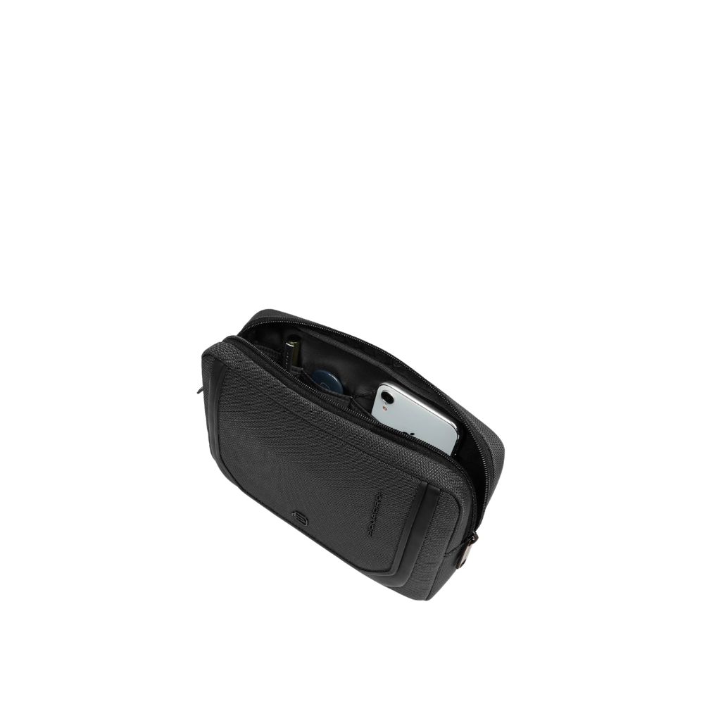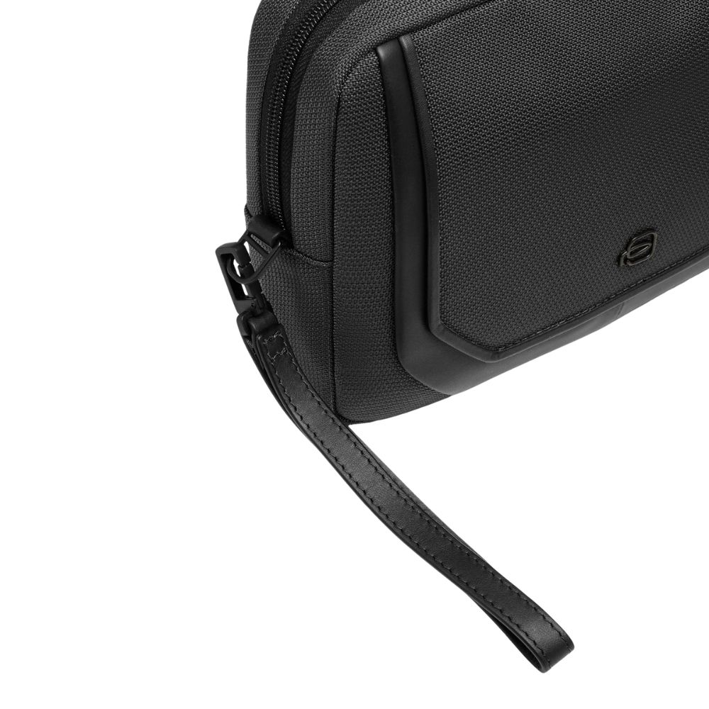 Men's recycled fabric and leather clutch bag with removable wristband and shoulder strap by Piquadro.