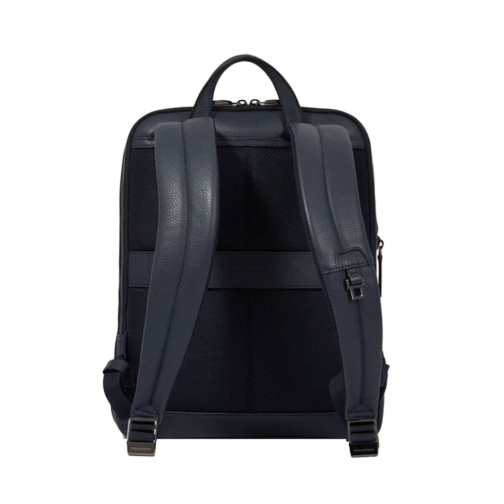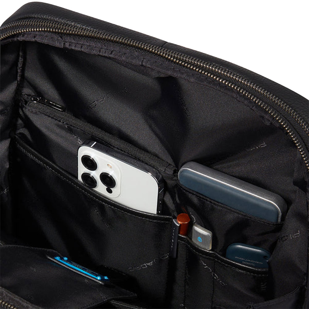 Men's slim leather backpack with laptop and iPad compartments by Piquadro, anti-theft cable, shock and RFID protection, expandable.