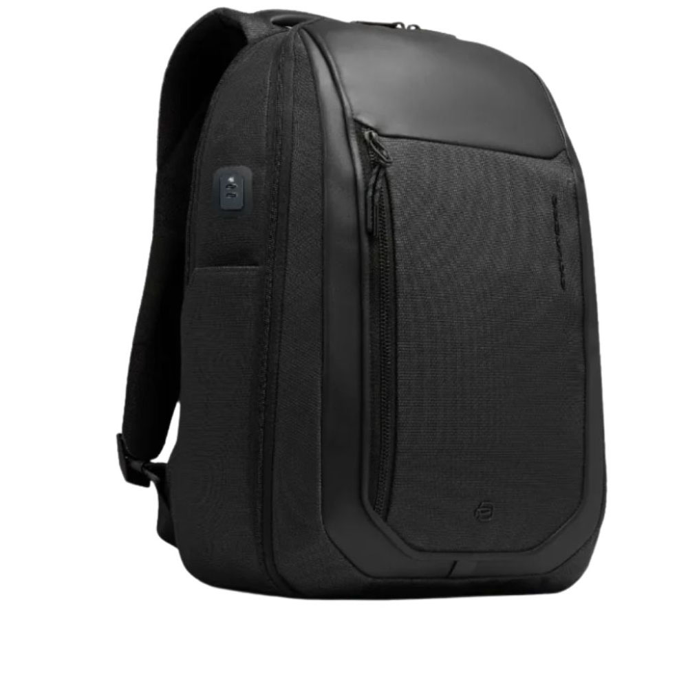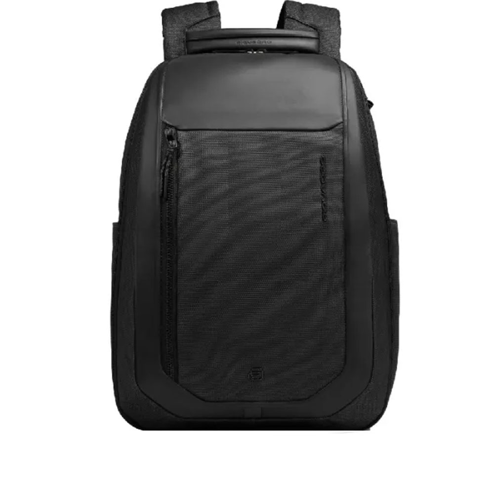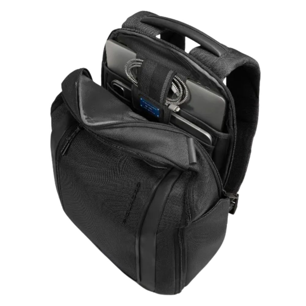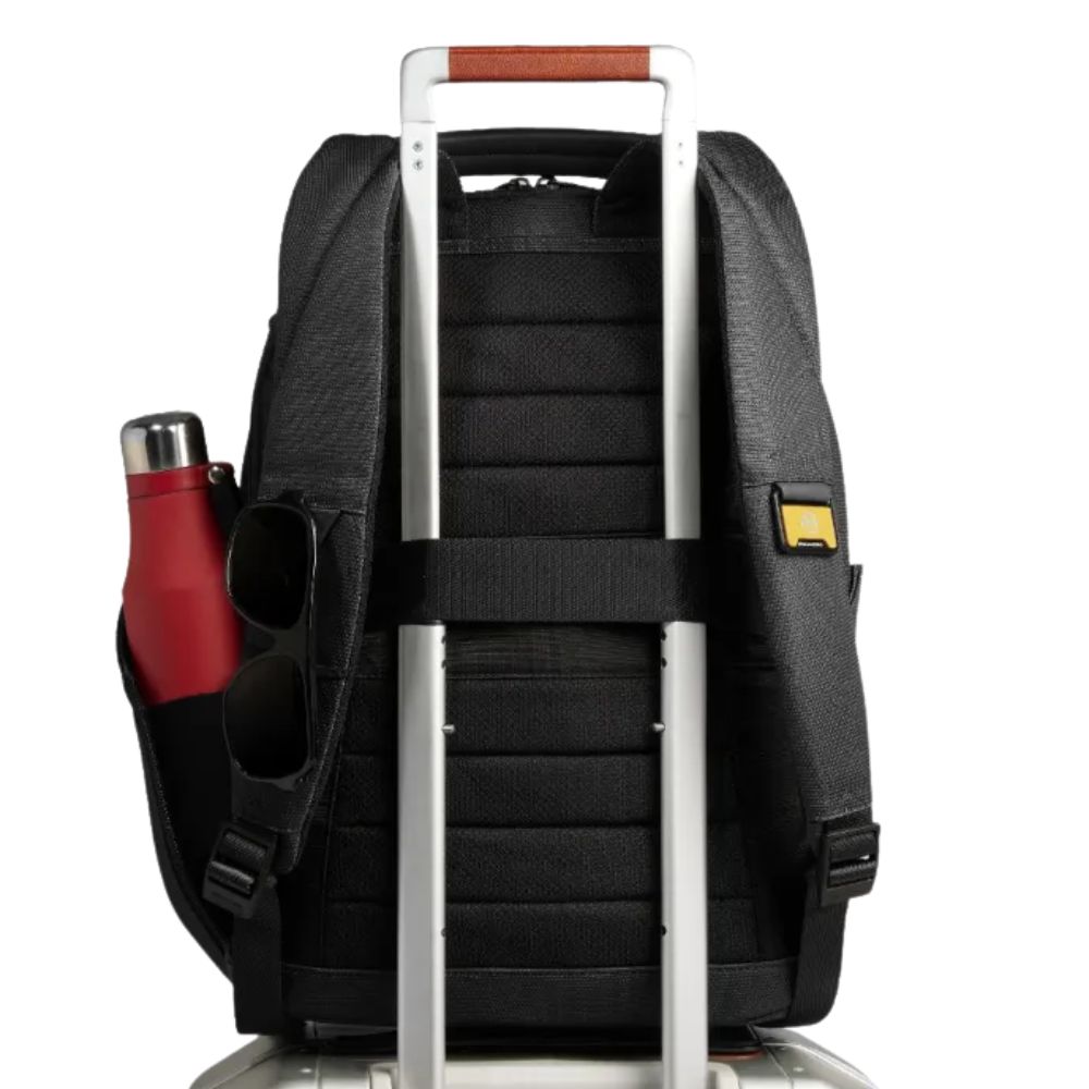 Piquadro's two-compartment PC and iPad backpack with USB and USB Type C ports, AirPods® pocket, glasses holder, shock protection and RFID.
