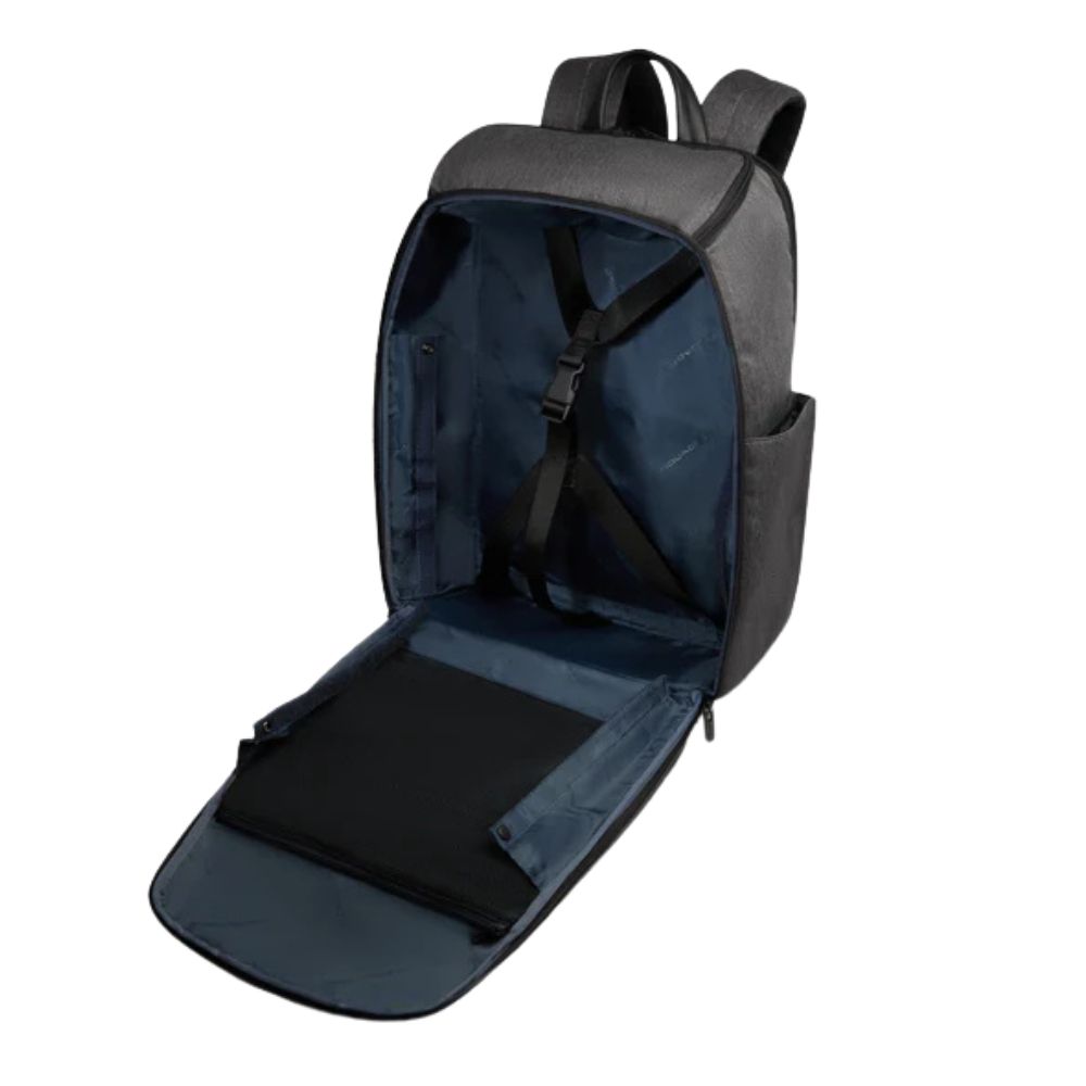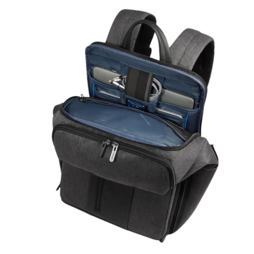 Travel backpack with PC and iPadPro 12.9" from Piquadro in recycled fabric, with chest strap, impact protection and RFID, compatible with Easyjet.