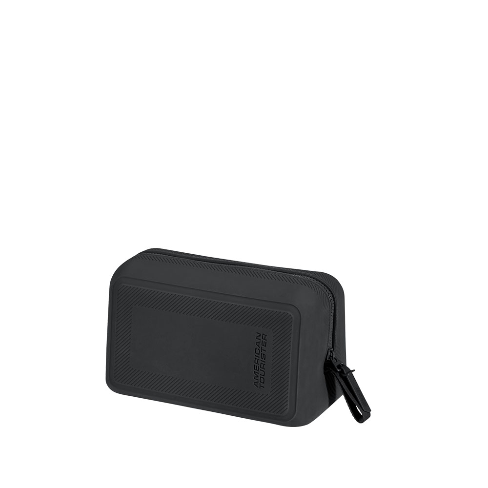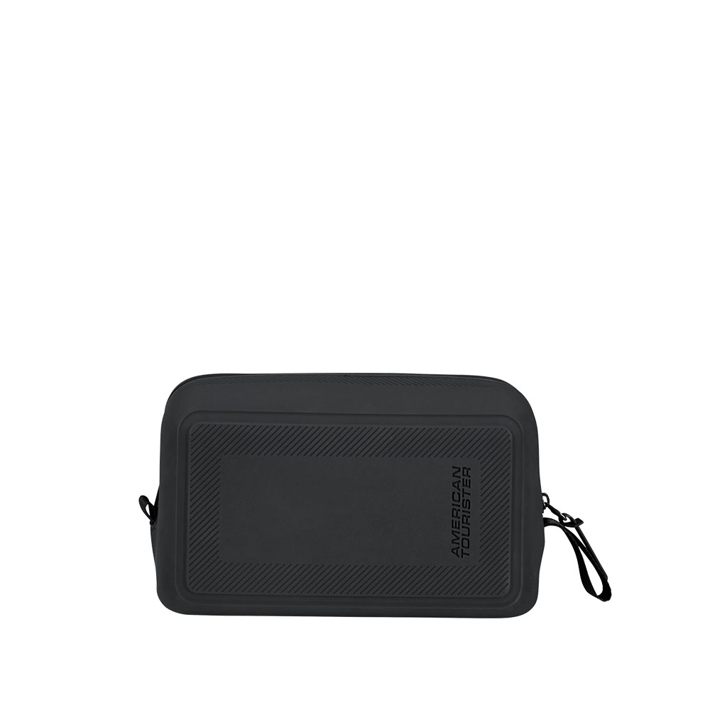 Soft silicone toiletry bag by American Tourister, with color-matching zip and logo on the front. Washable. Removable internal divider