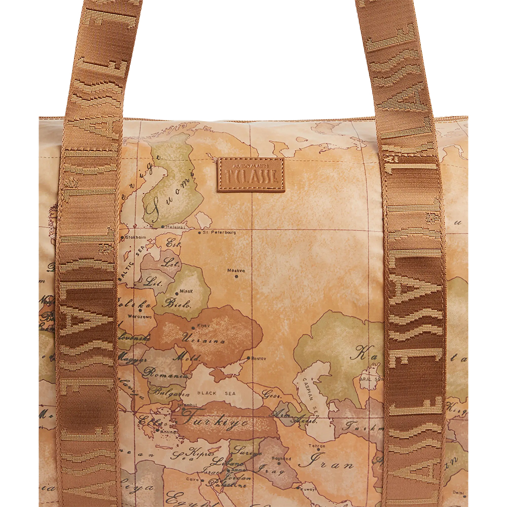 Il borsone Geo Soft di Alviero Martini in tessuto stampato con cartina geografica Geo Soft, manici a nastro con logo 1A Classe. Pratica e capiente,