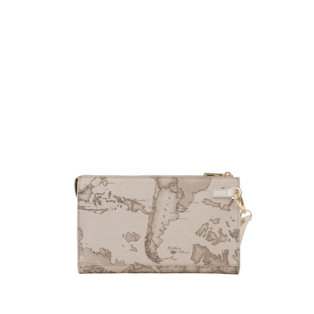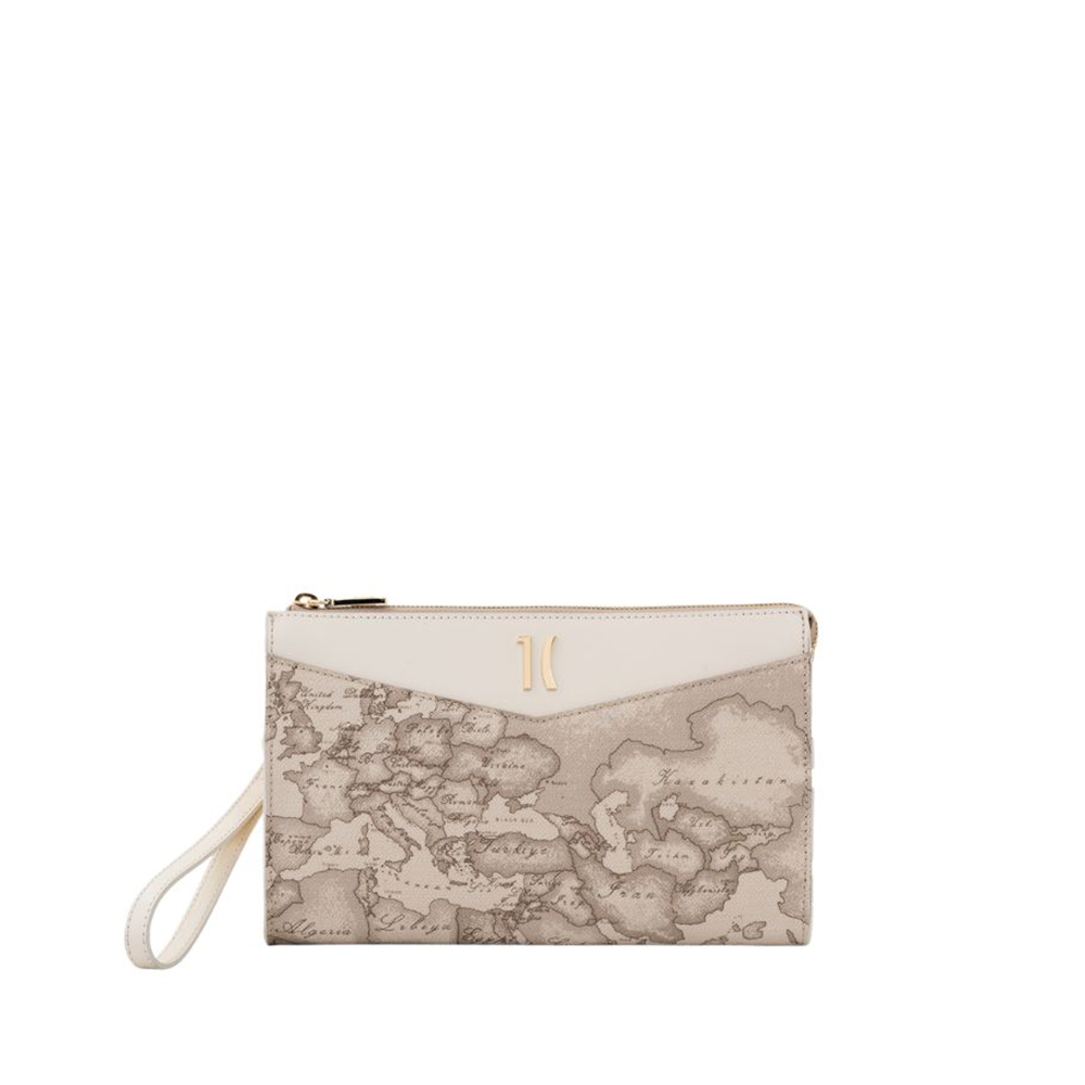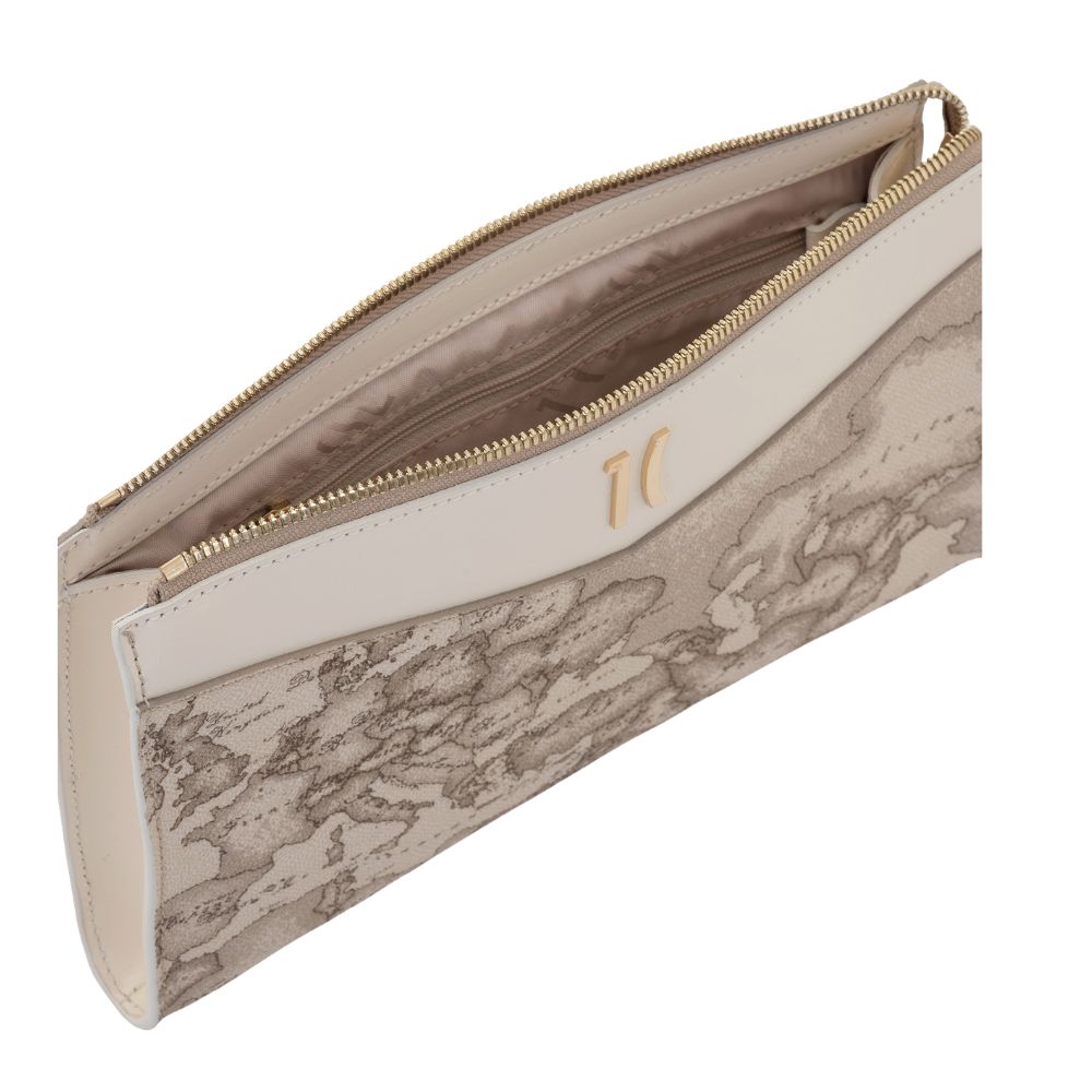 La clutch in tessuto Geo Safari di Alviero Martini è caratterizzata da linee nette e minimal, descritte dall'inserto in pelle liscia color Rafia sagomato a V. Il logo 1C con finitura oro chiaro illumina il modello, completo di polsiera rimovibile e chiuso con zip. Un modello dal design distintivo e versatile, perfetto per far risaltare abiti e completi da sera di ogni tonalità.