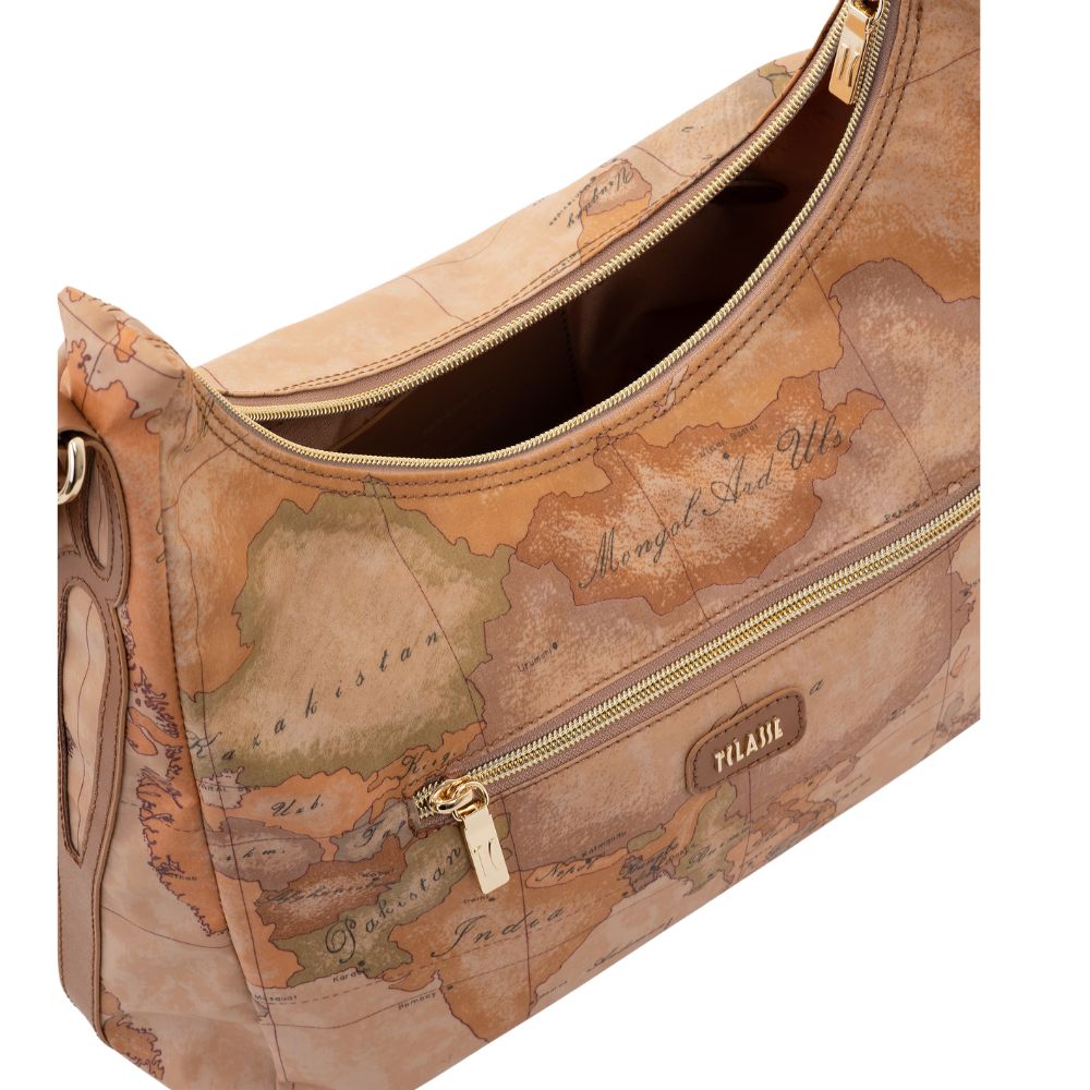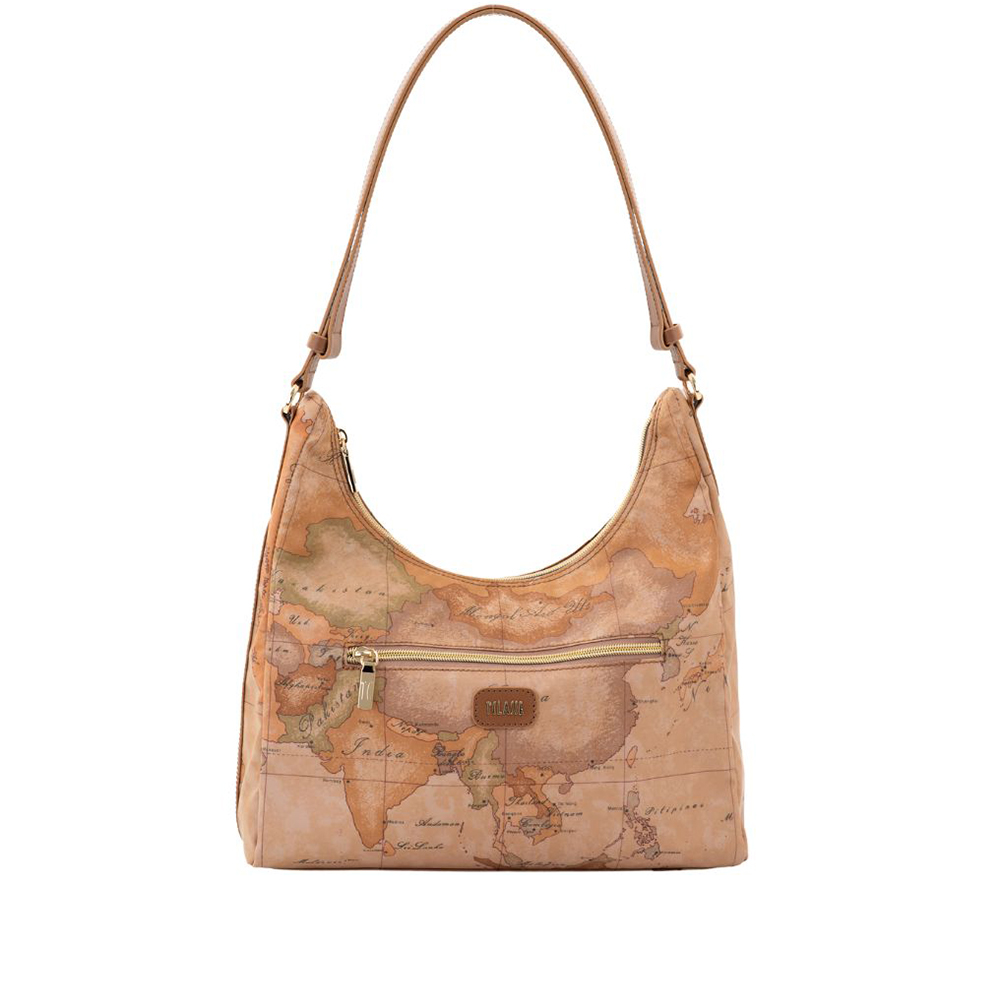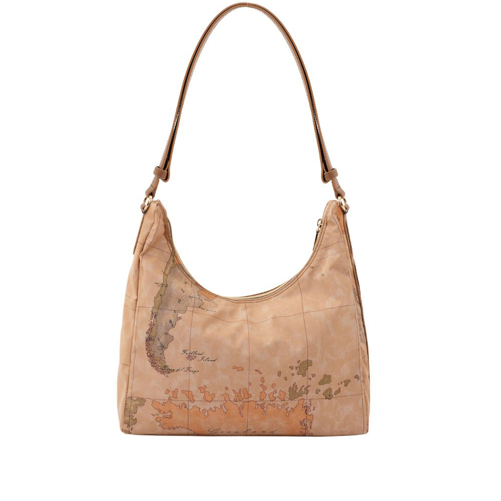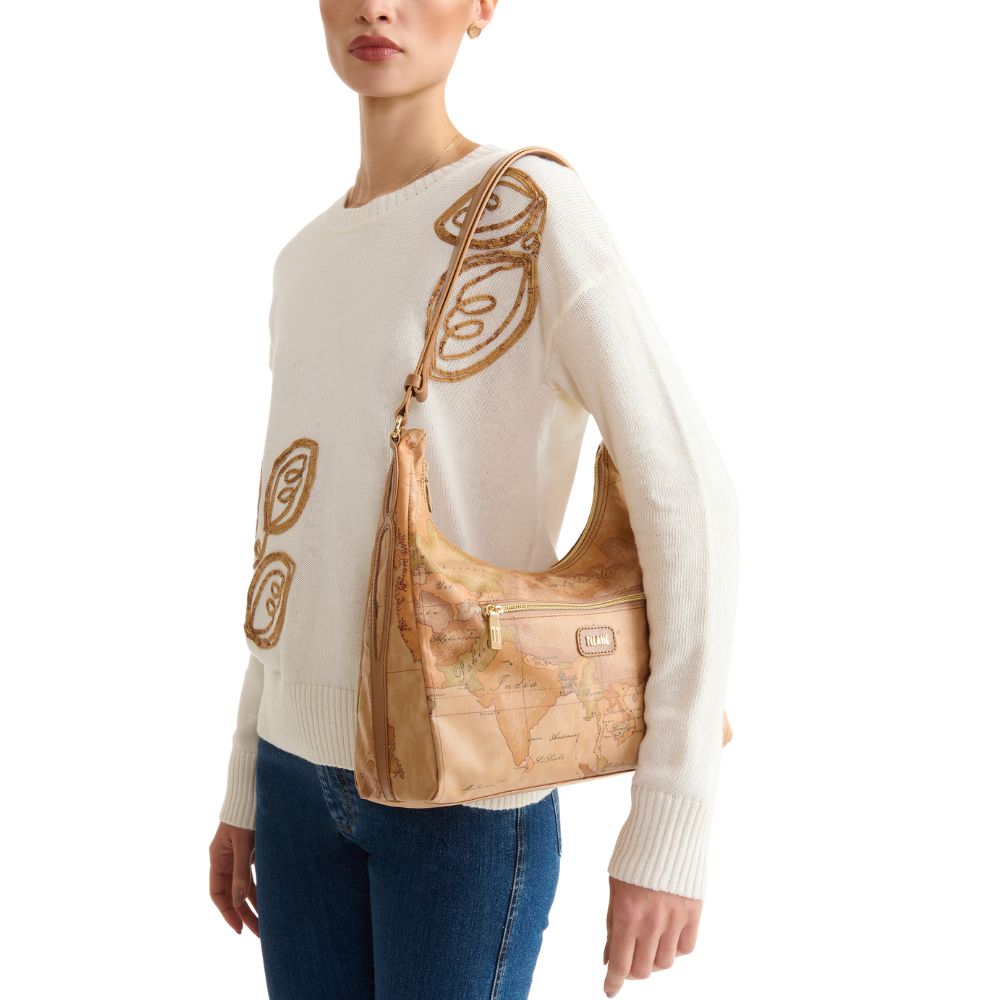 Il morbido tessuto soft di Alviero Martini è modellato in una sottospalla leggermente strutturata dal fianco largo e dalla testa scavata, per un look casual e funzionale e al contempo definito e di tendenza. L'iconica stampa Geo Classic è abbinata al dettaglio affusolato in pelle liscia sul fianco, ispirato alle linee delle foglie di eucalipto Australiano, e al patch frontale con logo 1AClasse in oro chiaro. Lo spallaccio regolabile in pelle liscia consente anche la portabilità crossbody, sganciando i due bottoni a gemello e facendo scorrere le due estremità. Una borsa che abbina armoniosamente praticità e cura dei dettagli, perfetta per un look contemporaneo.