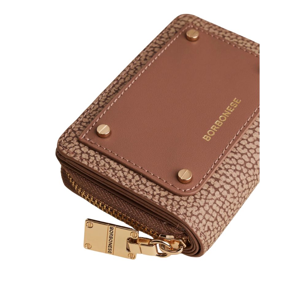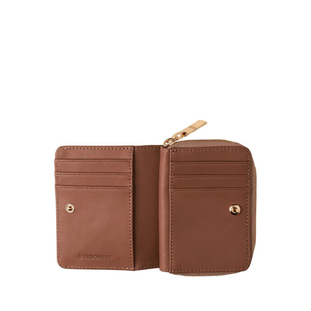 Il portafoglio piccolo di Borbonese è impreziosito dalla tasca esterna in pelle decorata da quattro rivetti logati in metallo. Il suo spazio è organizzato al meglio per riporvi l'indispensabile con ordine e cura.