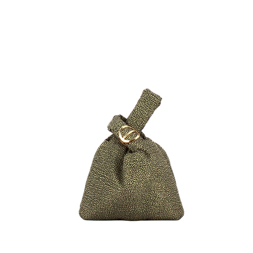 La borsa a mano di Borbonese della linea Twinnie può essere portata a mano incrociando i due manici creando un deliziso effetto a fiocco.