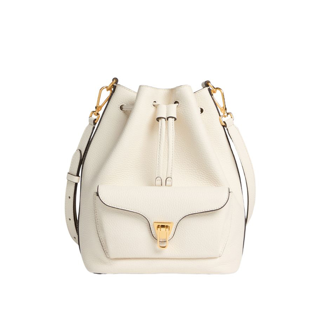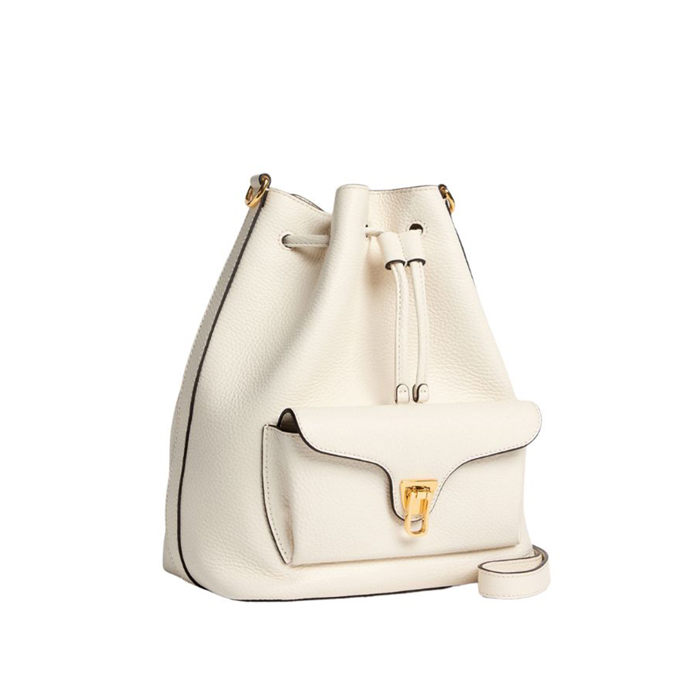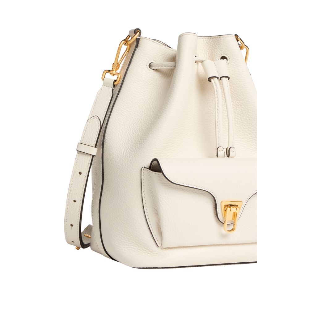 Il secchiello Beat Generation di Coccinelle, comodo ed elegante, è arricchito da una tasca esterna caratterizzata dall'iconica chiusura in metallo a forma di plettro.