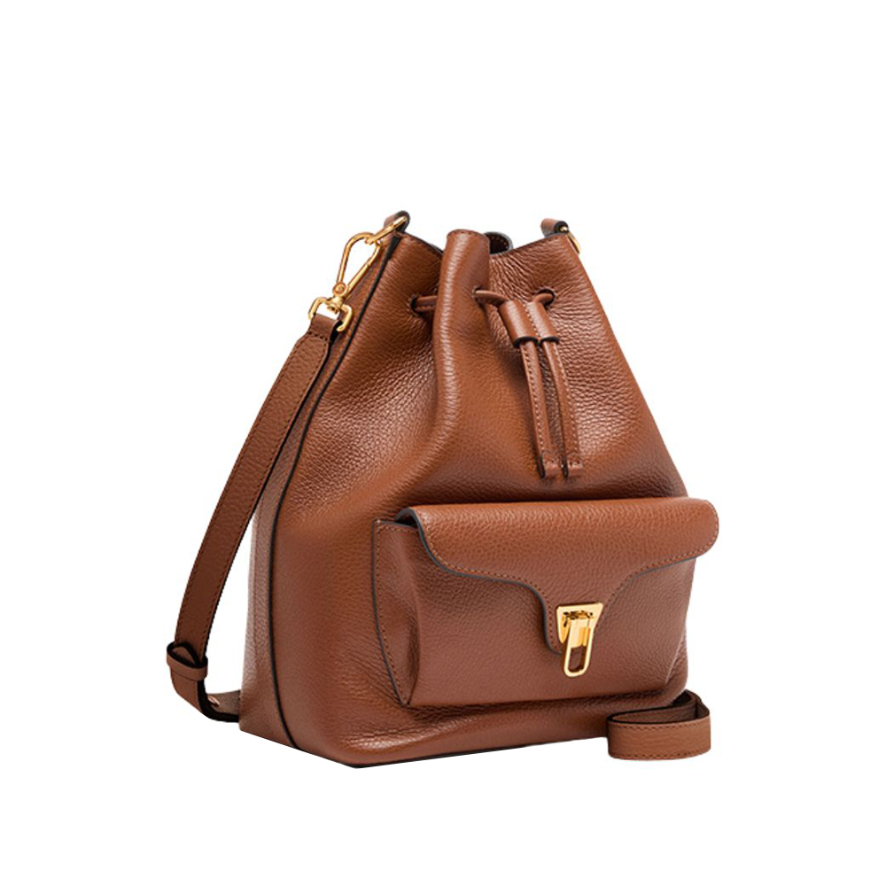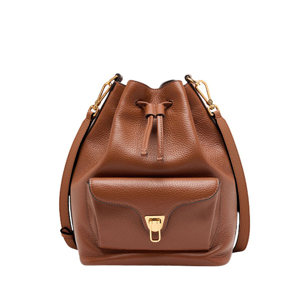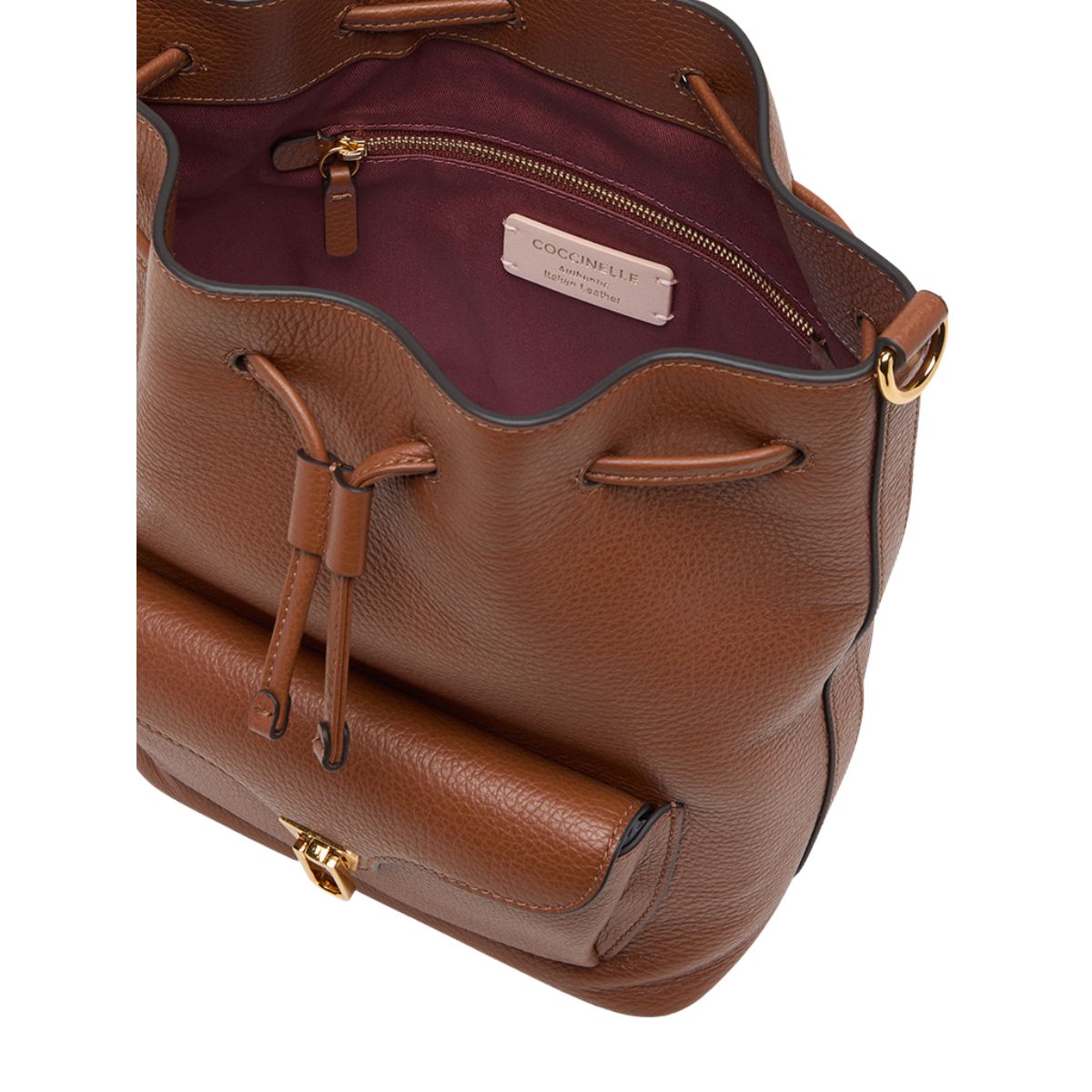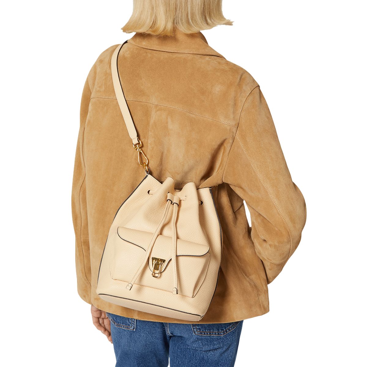 Il secchiello Beat Generation di Coccinelle, comodo ed elegante, è arricchito da una tasca esterna caratterizzata dall'iconica chiusura in metallo a forma di plettro.