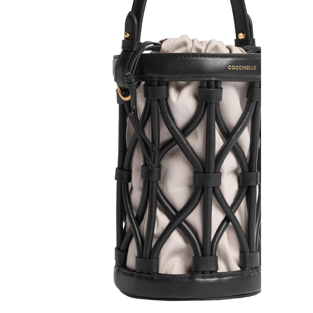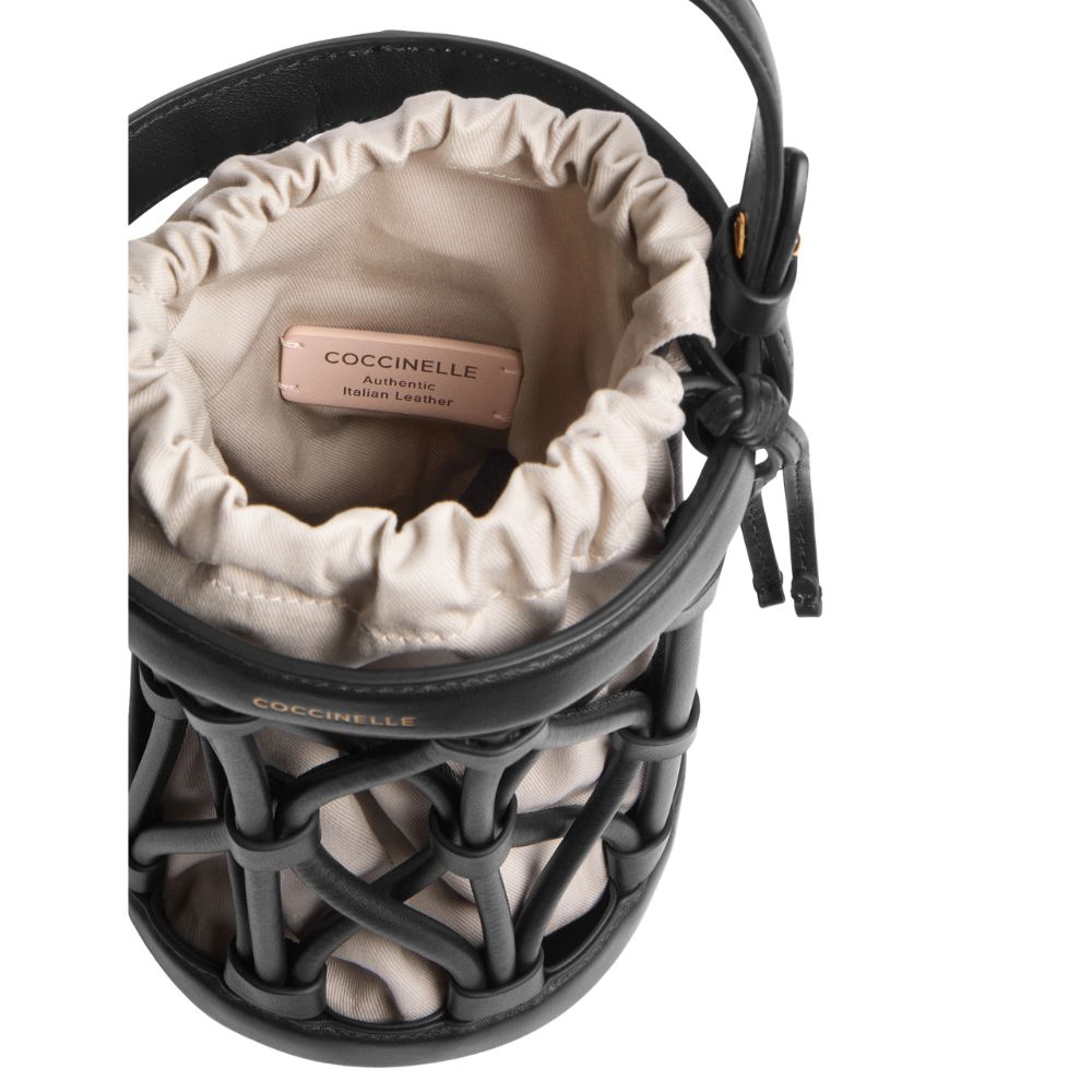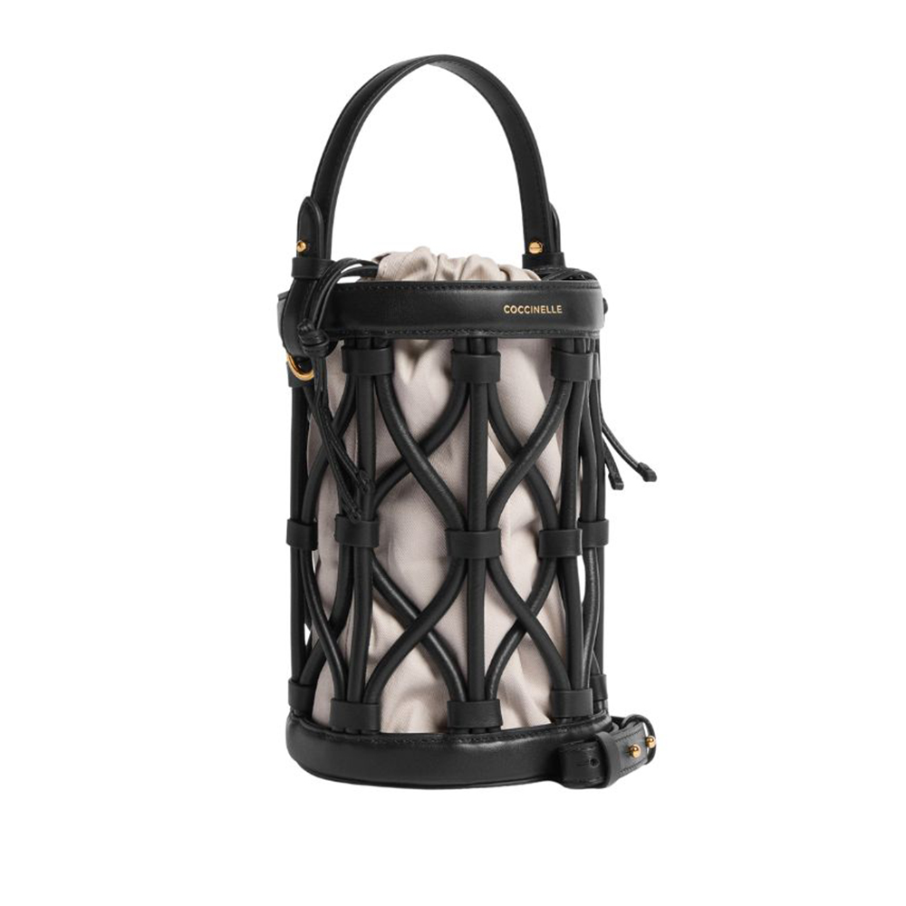 La linea Koi di Coccinelle prende ispirazione dalle antiche nasse di giunco utilizzate per la pesca. La borsa è composta da un secchiello di forma cilindrica con portabilità sia a mano che a tracolla, sfoderato, ma dotato di una pouch removibile con chiusura coulisse. Coccinelle Koi prende forma dallintreccio di tubolari in pelle liscia, che donano unicità e ricercatezza alla borsa. Questo modello è realizzato in pellame liscio conciato con speciali grassi che lo rendono morbido al tatto. Nonostante l'aspetto setoso si tratta di un pellame resistente agli agenti atmosferici grazie all'utilizzo di resine che rendono la pelle leggermente impermeabile pur mantenendone l'aspetto naturale.