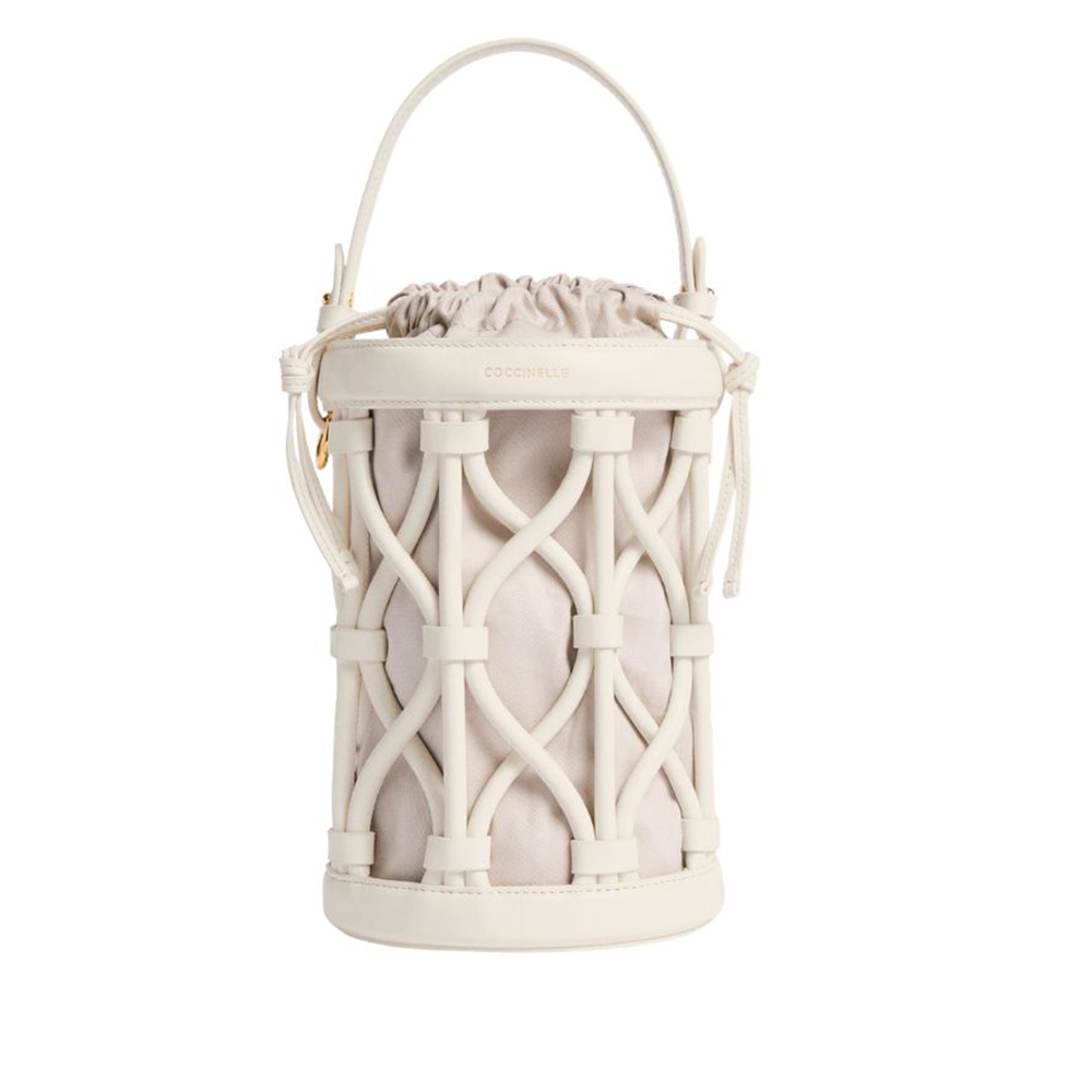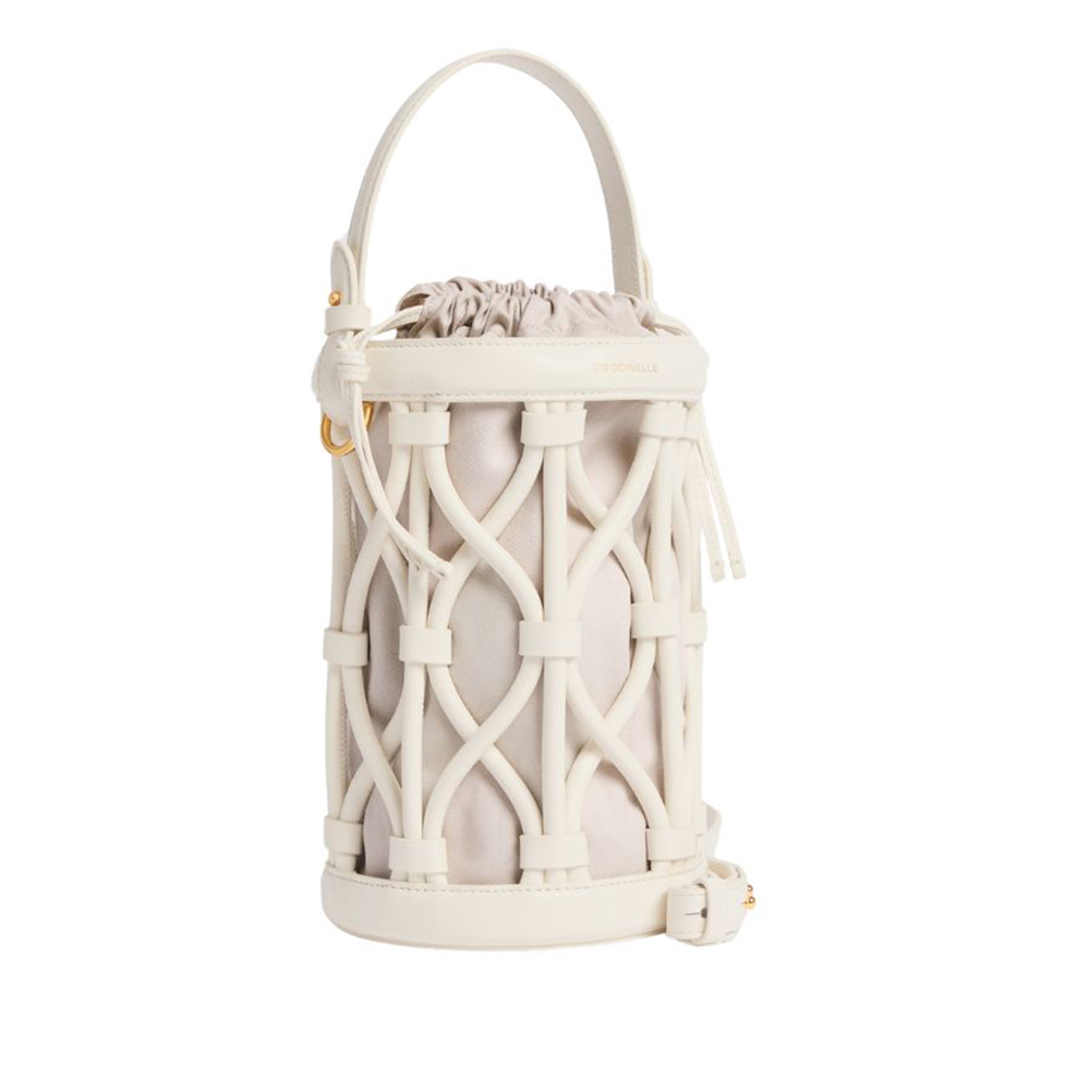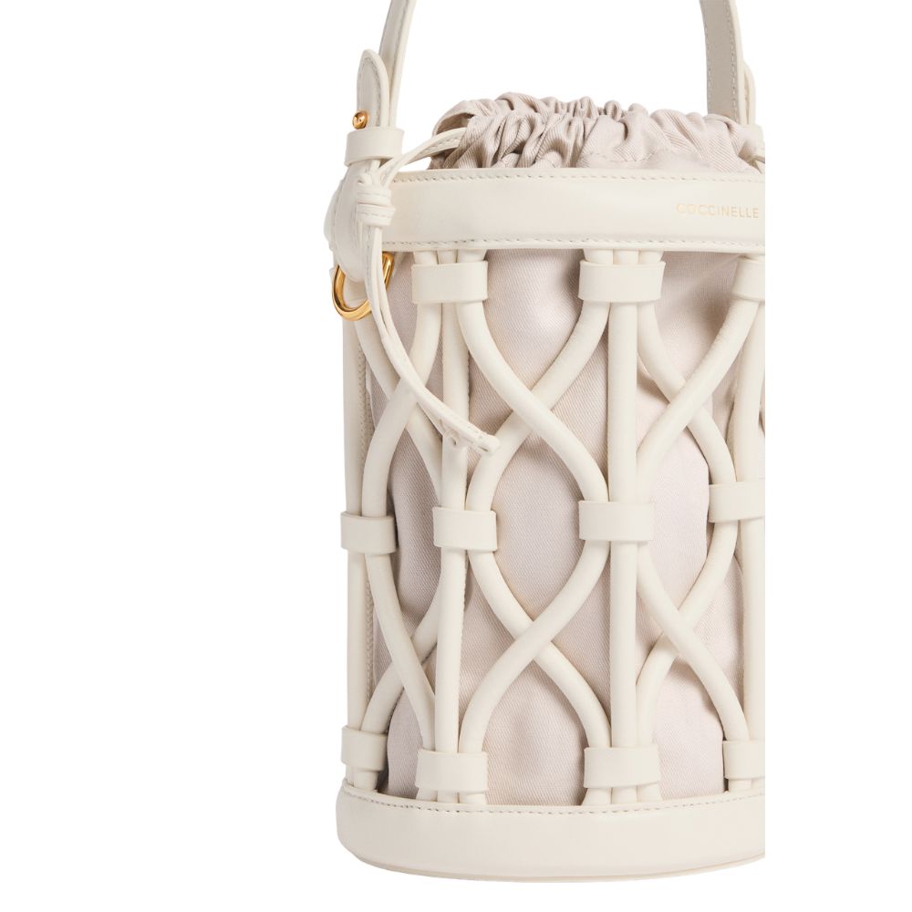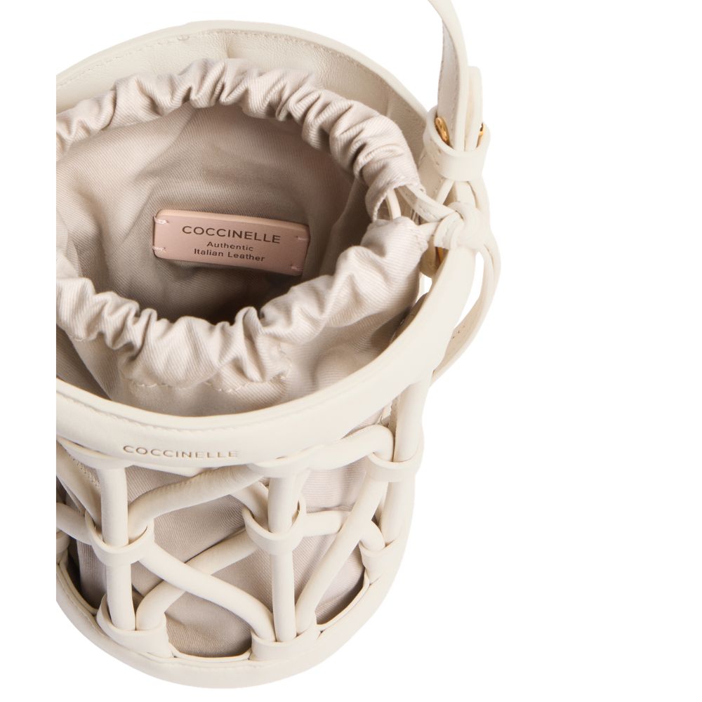 La linea Koi di Coccinelle prende ispirazione dalle antiche nasse di giunco utilizzate per la pesca. La borsa è composta da un secchiello di forma cilindrica con portabilità sia a mano che a tracolla, sfoderato, ma dotato di una pouch removibile con chiusura coulisse. Coccinelle Koi prende forma dallintreccio di tubolari in pelle liscia, che donano unicità e ricercatezza alla borsa. Questo modello è realizzato in pellame liscio conciato con speciali grassi che lo rendono morbido al tatto. Nonostante l'aspetto setoso si tratta di un pellame resistente agli agenti atmosferici grazie all'utilizzo di resine che rendono la pelle leggermente impermeabile pur mantenendone l'aspetto naturale.