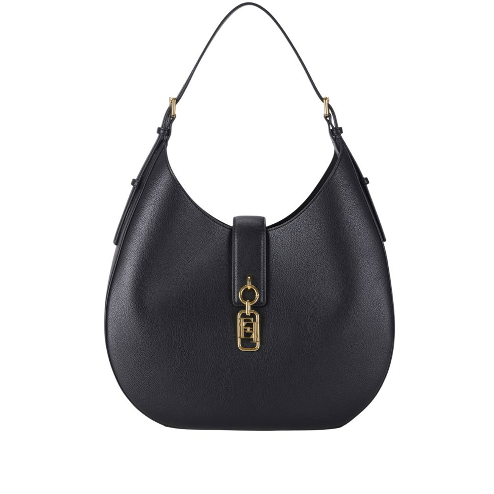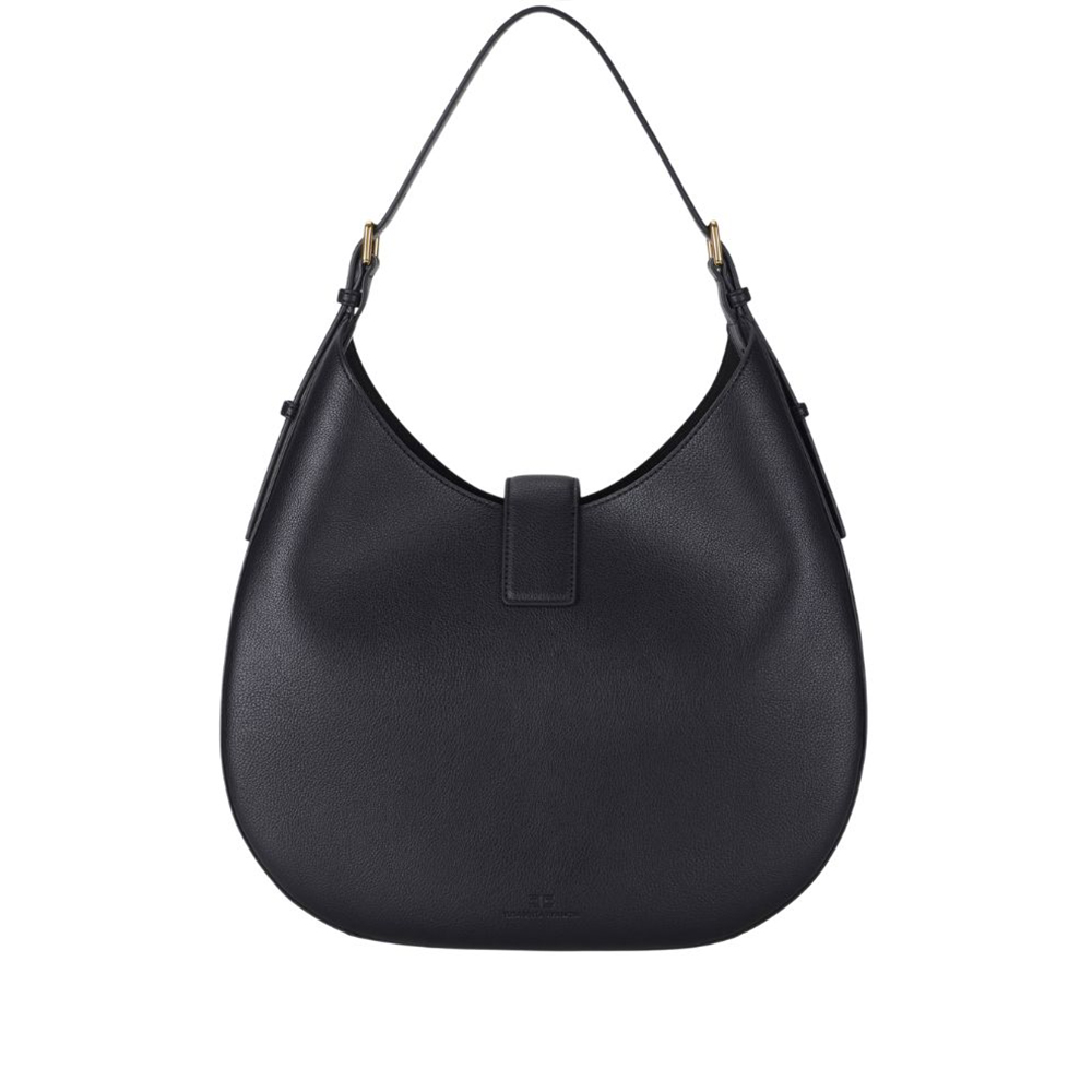 Borsa hobo tonda di Elisabetta Franchi realizzata in materiale sintetico con texture effetto pelle. L'accessorio ha manico con fibbie e chiusura con linguetta, impreziosita dal dettaglio di charm con logo.