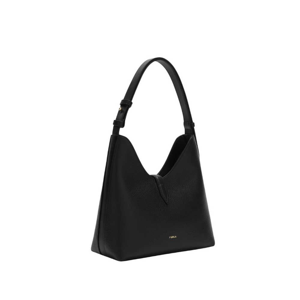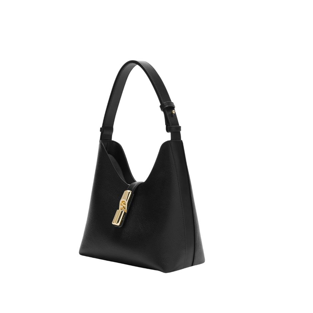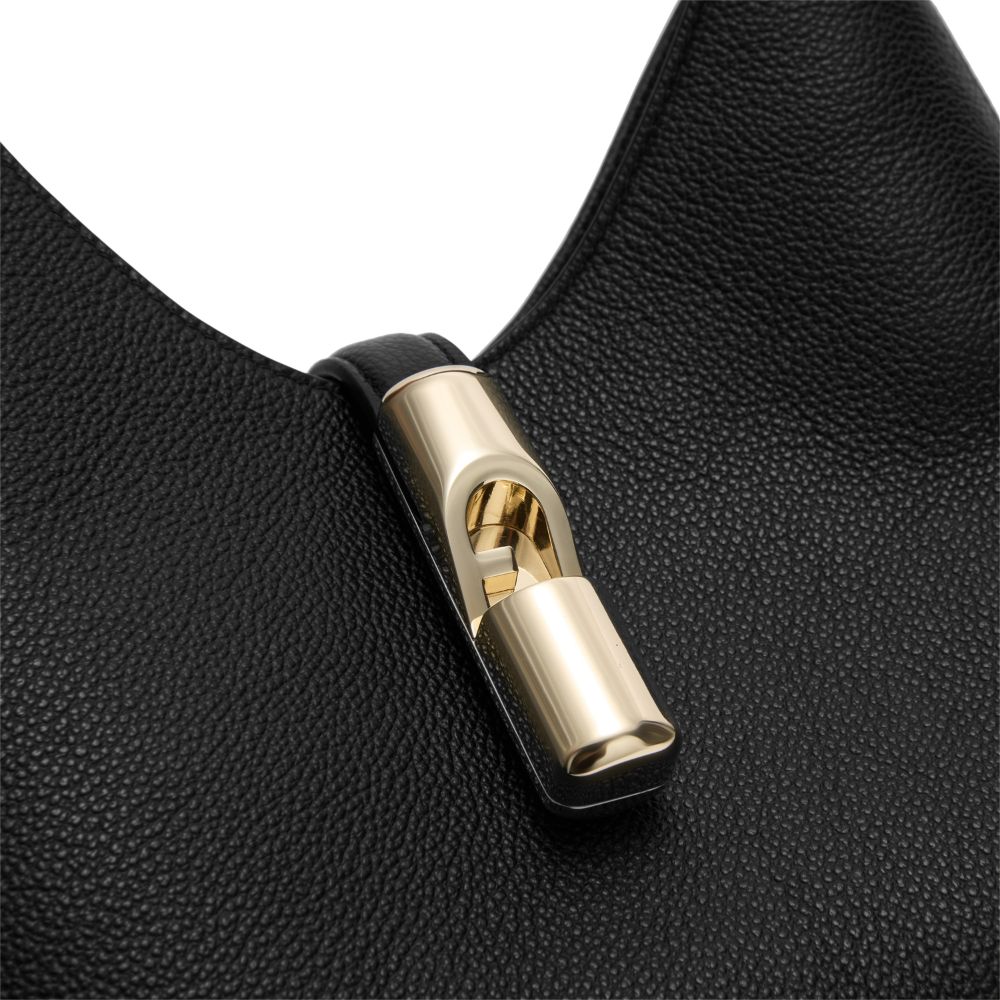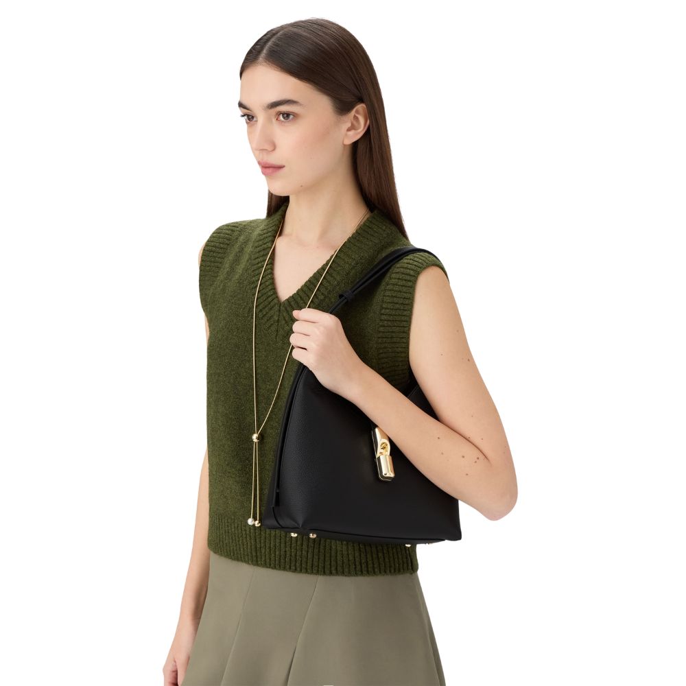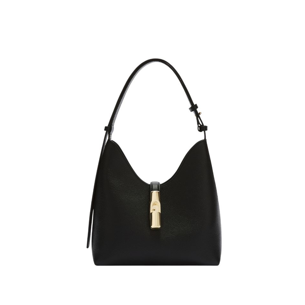 La borsa a spalla Goccia di Furla si distingue per la silhouette morbida e destrutturata realizzata in pelle liscia e vitello stampato. La borsa è arricchita da una fascetta abbinata al manico regolabile in pelle a contrasto. Il nuovo hardware ciclindrico con pesetto e logo Arco Furla chiude elegantemente il modello.