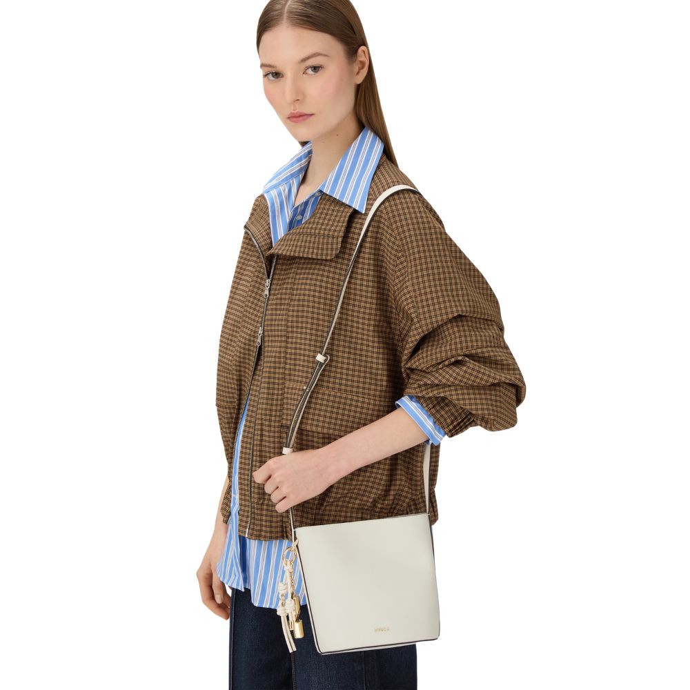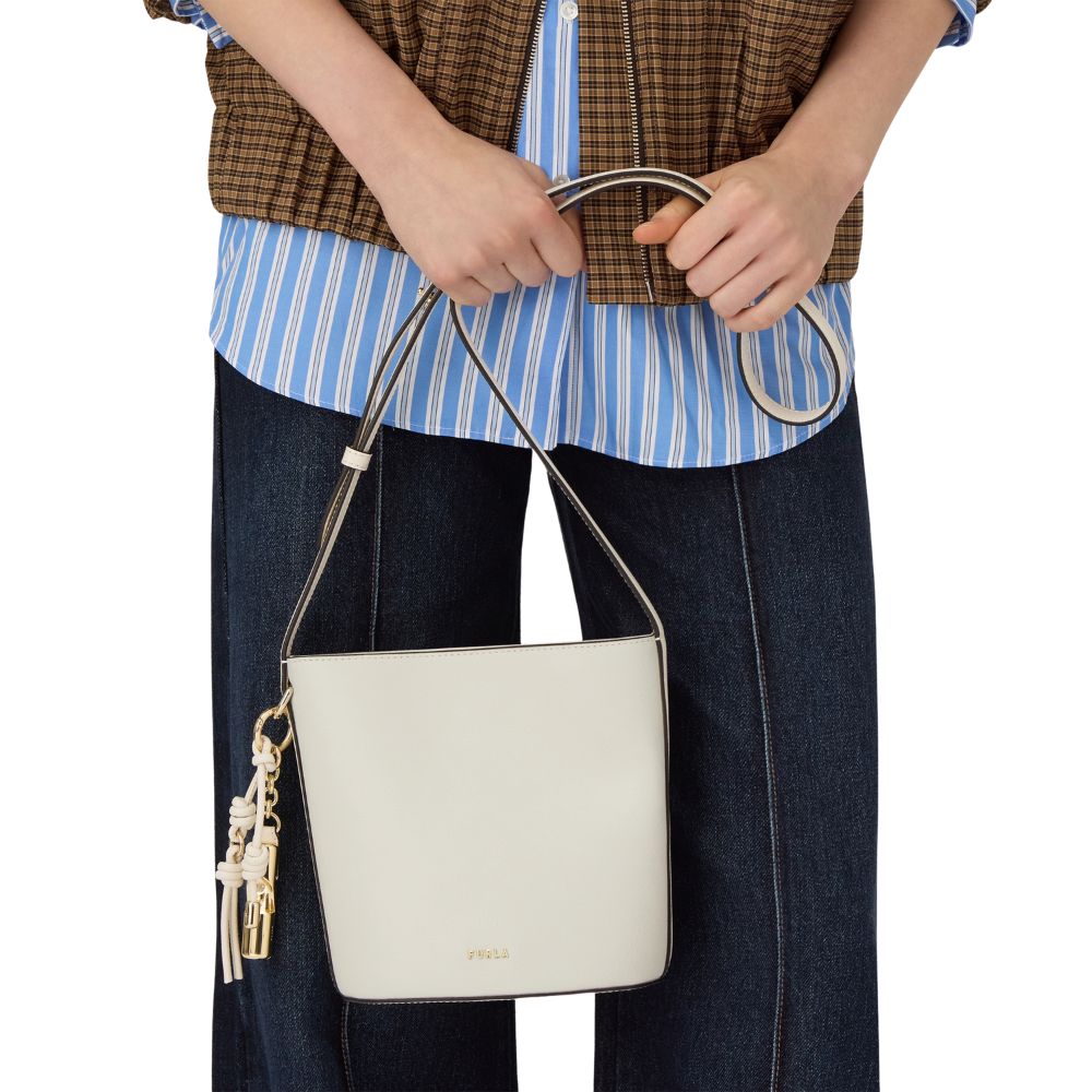 La borsa a secchiello Roxie di Furla è il mini secchiello perfetto per contenere l'essenziale. Il fondo è morbido e flessibile, mentre il modello dal design strutturato viene esaltato dalla pregiata pelle con finitura stampata. Ideale per un indosso a mano, si presta anche come borsa a bandoliera grazie alla tracolla fissa e regolabile con sistema a funghetto. Aggiunge un tocco distintivo all'accessorio il charm cilindrico rimovibile corredato da due cordoncini intrecciati.