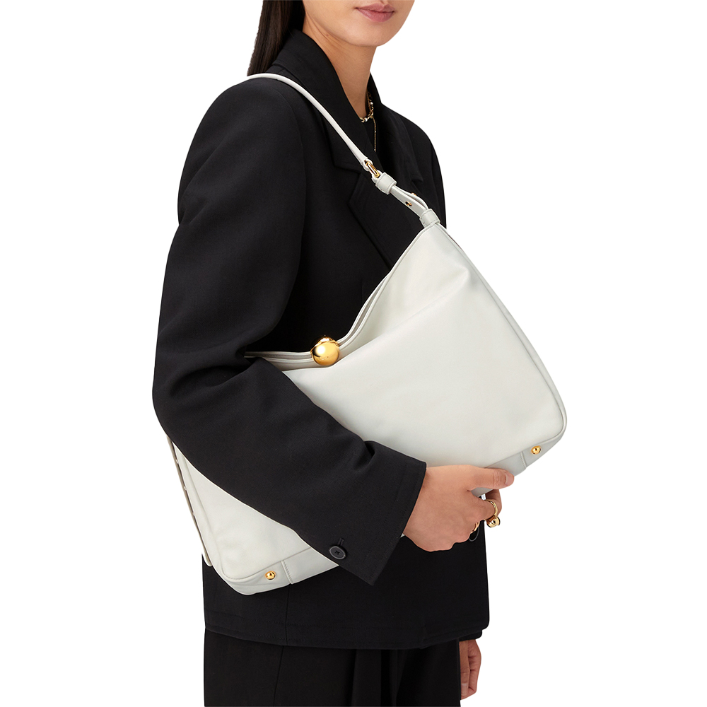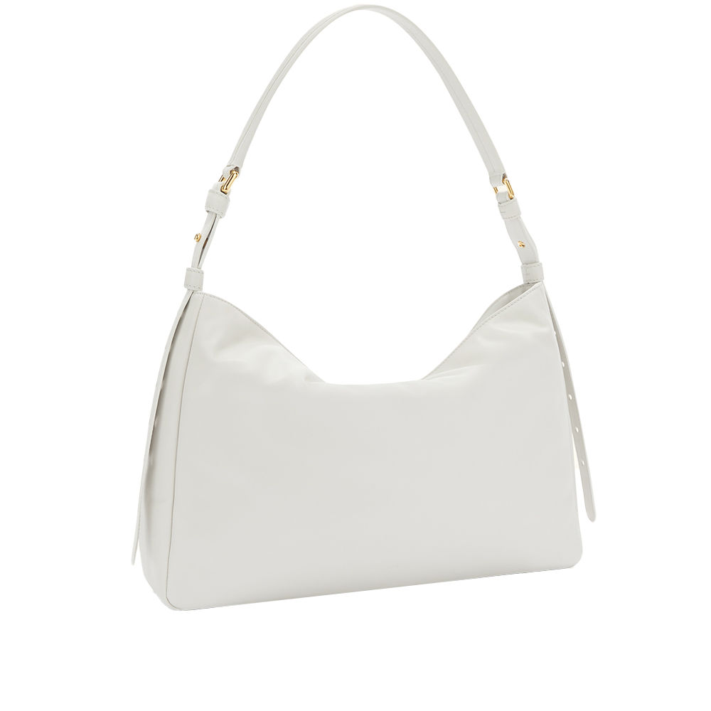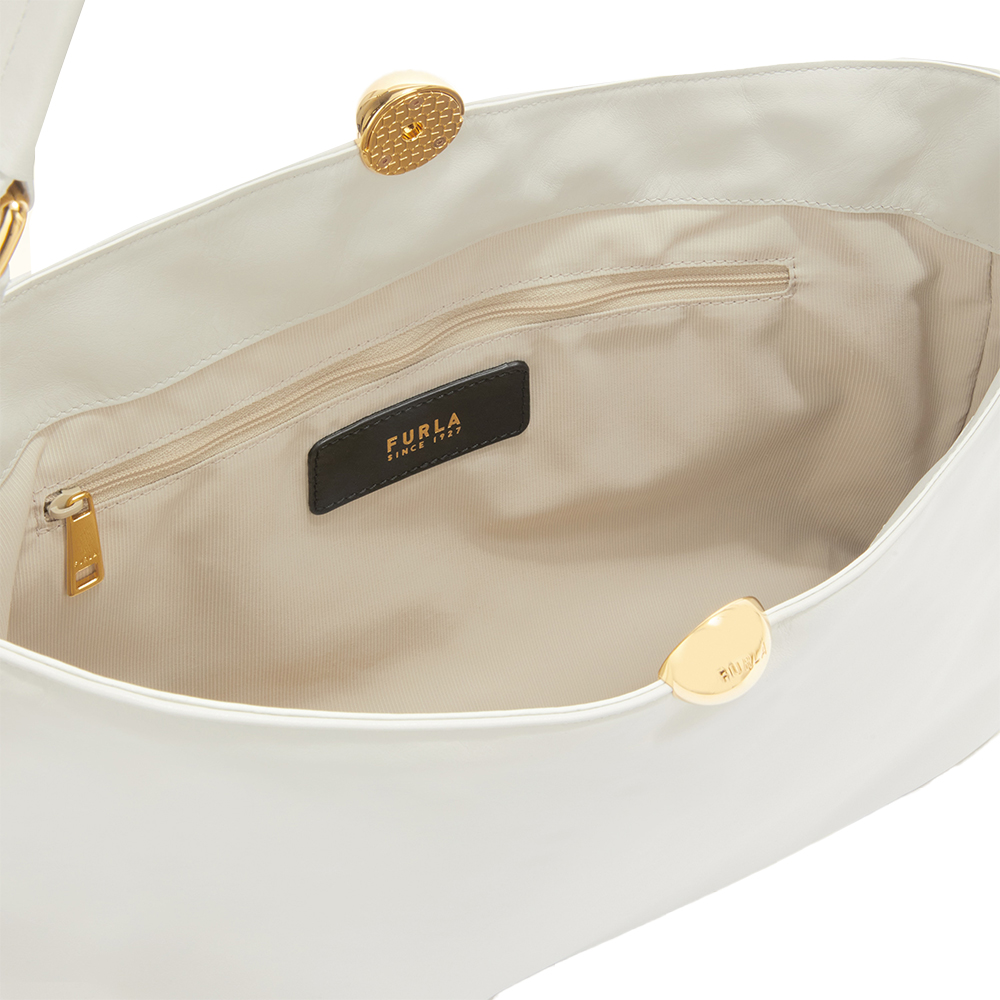 La borsa Sfera Soft di Furla ha un design elegante dall'allure raffinato. La leggera e morbida nappa liscia imbottita si modella sotto il peso dell'hardware rotondo a Sfera che ricrea un naturale movimento di drappeggio. Le ampie dimensioni sono perfette per riporvi tutti gli effetti personali e la struttura flessibile si adatta all'indosso a spalla.