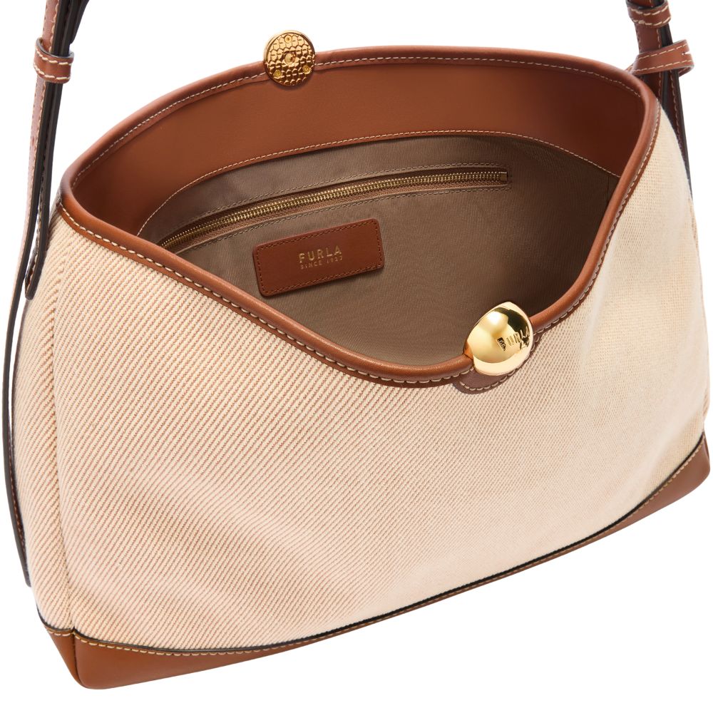 La borsa a spalla Sfera Soft di Furla ha un design elegante dall'allure raffinato. La leggera e tela si modella sotto il peso dell'hardware rotondo a Sfera che ricrea un naturale movimento di drappeggio. Rifinita da pregiati dettagli in pelle liscia, presenta una struttura flessibile che si adatta perfettamente all'indosso a spalla.