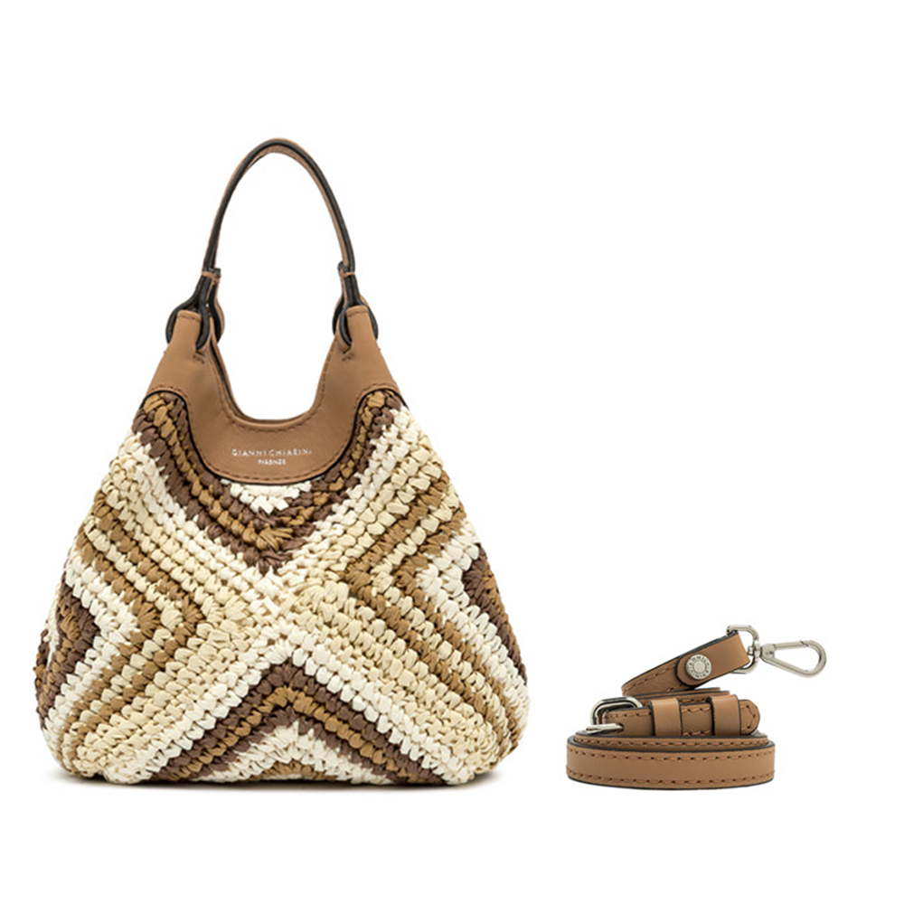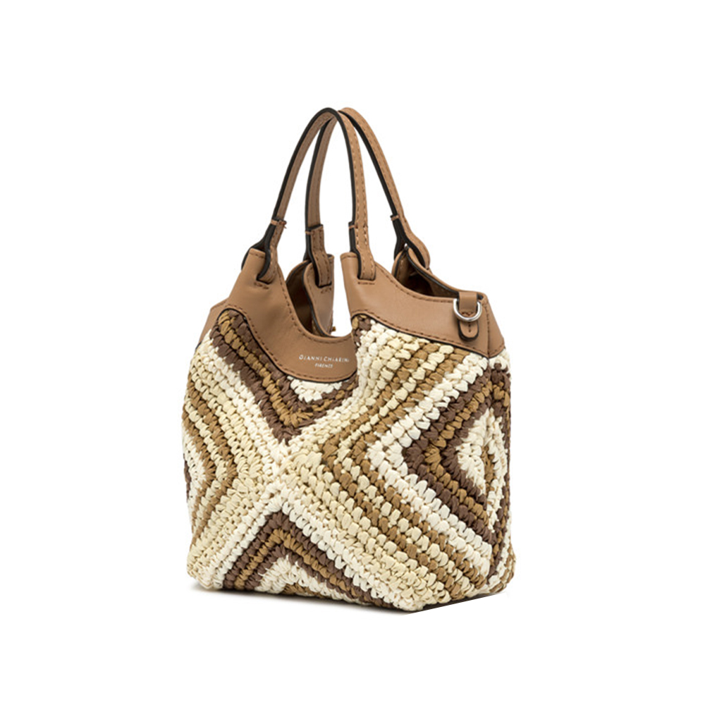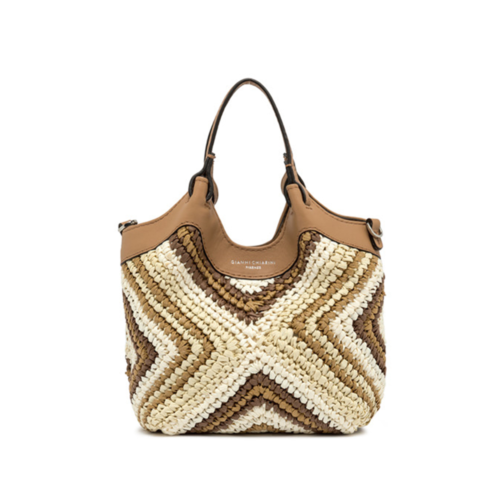 L'icona del brand Gianni Chiarini, la borsa DUA, è realizzata in paglia intrecciata, caratterizzata da una texture unica e distintiva. Dotata di un monoscomparto, presenta profili superiori in pelle e doppi manici in tono. Pratica ed essenziale, è perfetta per completare ogni look con stile. Può essere portata a mano o a spalla.