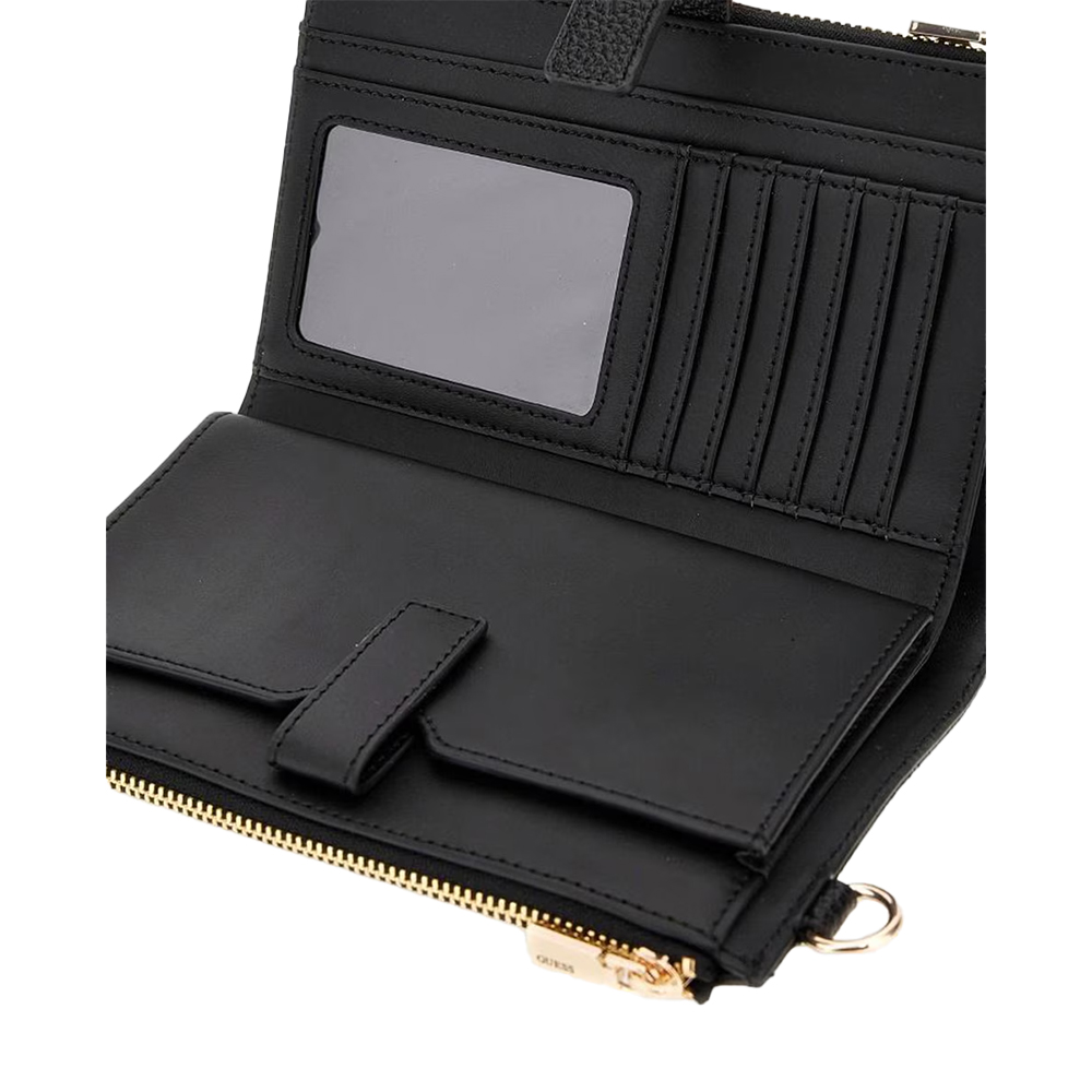 Il portafoglio da donna Cresidia II Slg di Guess con chiusura a clip. Questo portafoglio presenta ampio portacarte, tasca portamonete con chiusura zip e tasca porta documenti.