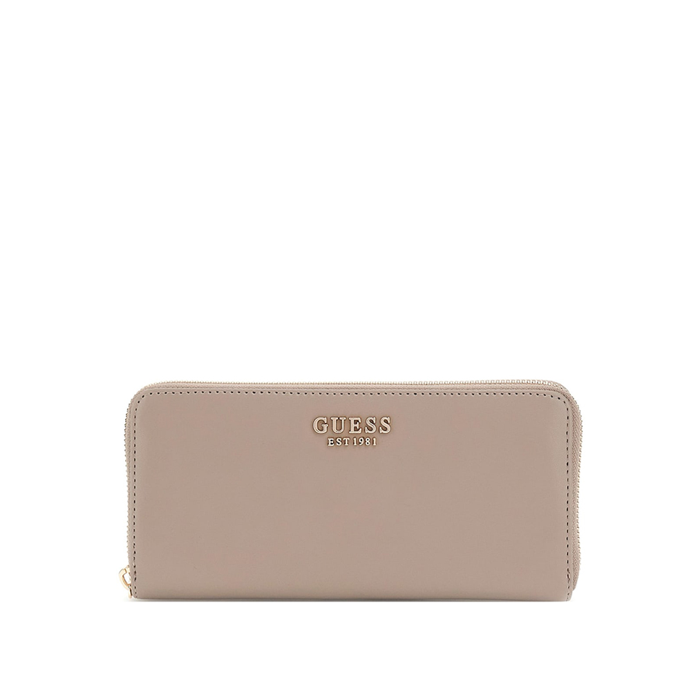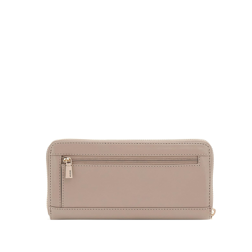 Laurel è il portafoglio zip around di Guess, con potamonete centrale zippato, alloggiamenti per le tessere e polsiera sganciabile.