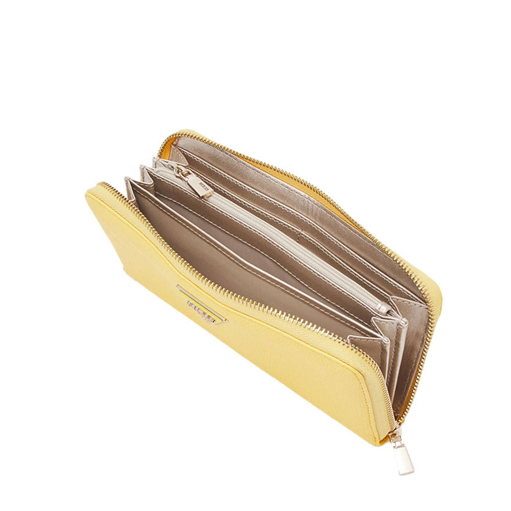 Portafoglio Laurel Zip Around Grande di Guess. Scomparto per monte centrale con zip, slot per tessere e portabanconote. Chiusura con cerniera. Polsiera removibile.
