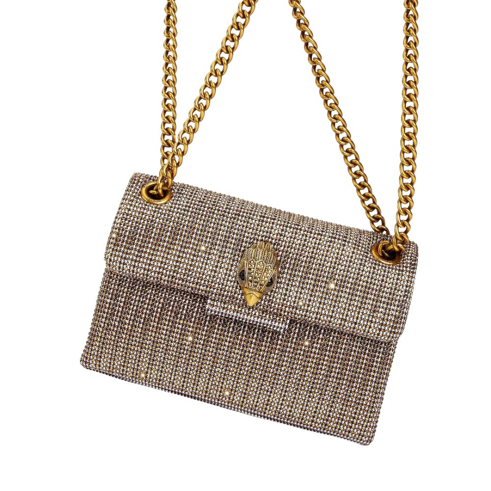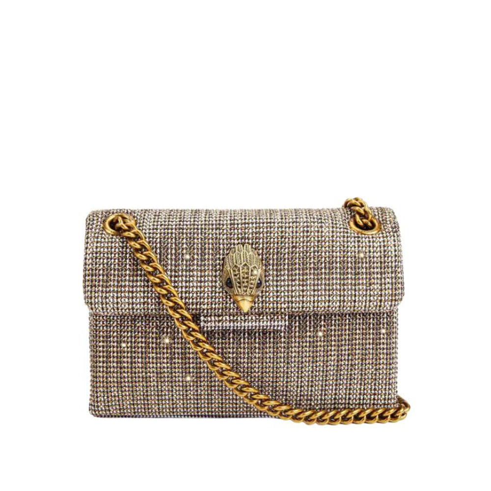 La Kensington Mini di Kurt Geiger in tessuto è realizzata in tessuto pied de poule impreziosito da cristalli in ottone. La testa d'aquila in ottone anticato presenta cristalli in ottone opaco e occhi con perline nere sulla patta frontale.