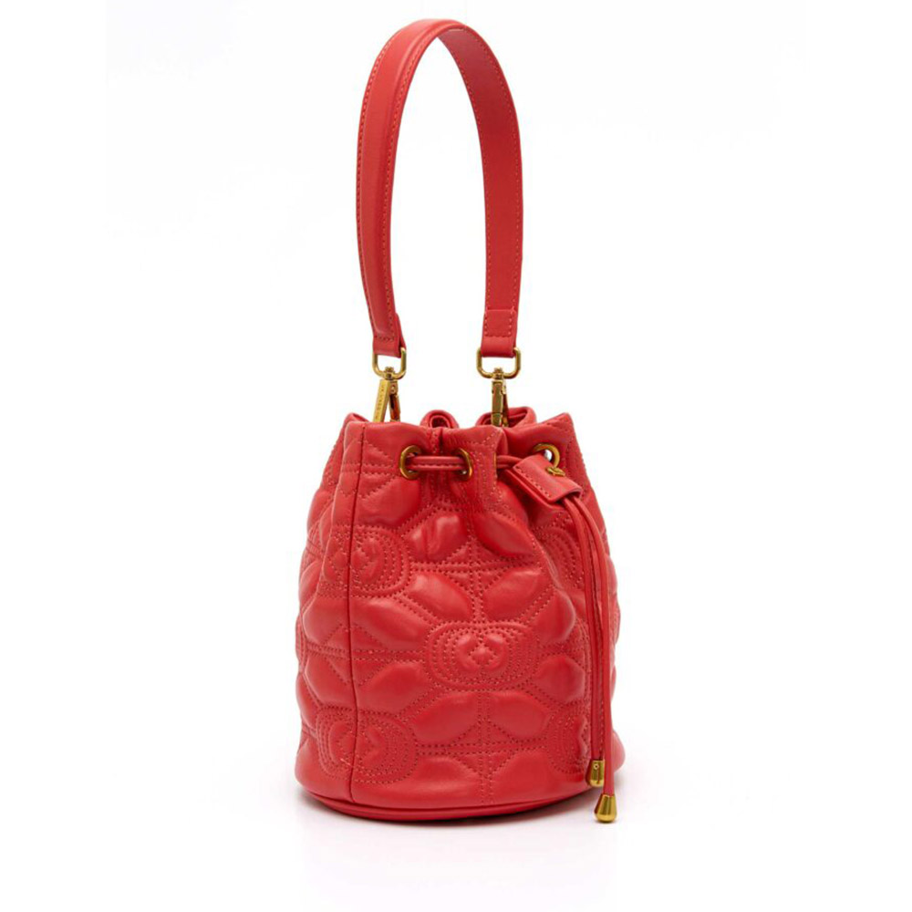 Secchiello in pelle imbottita e trapuntata della linea Touchy di La Carrie con manico di pelle e tracolla di catena rimovibile.