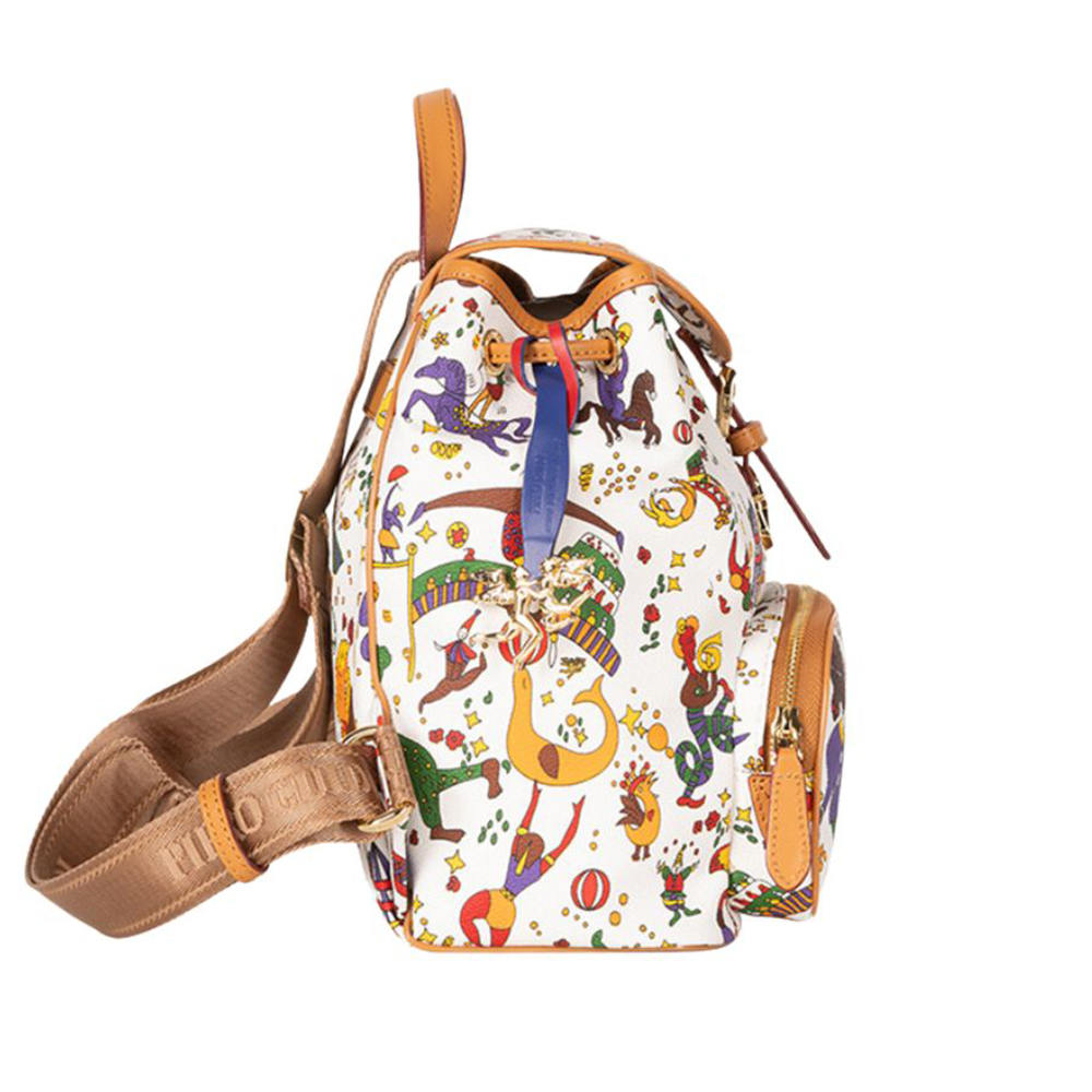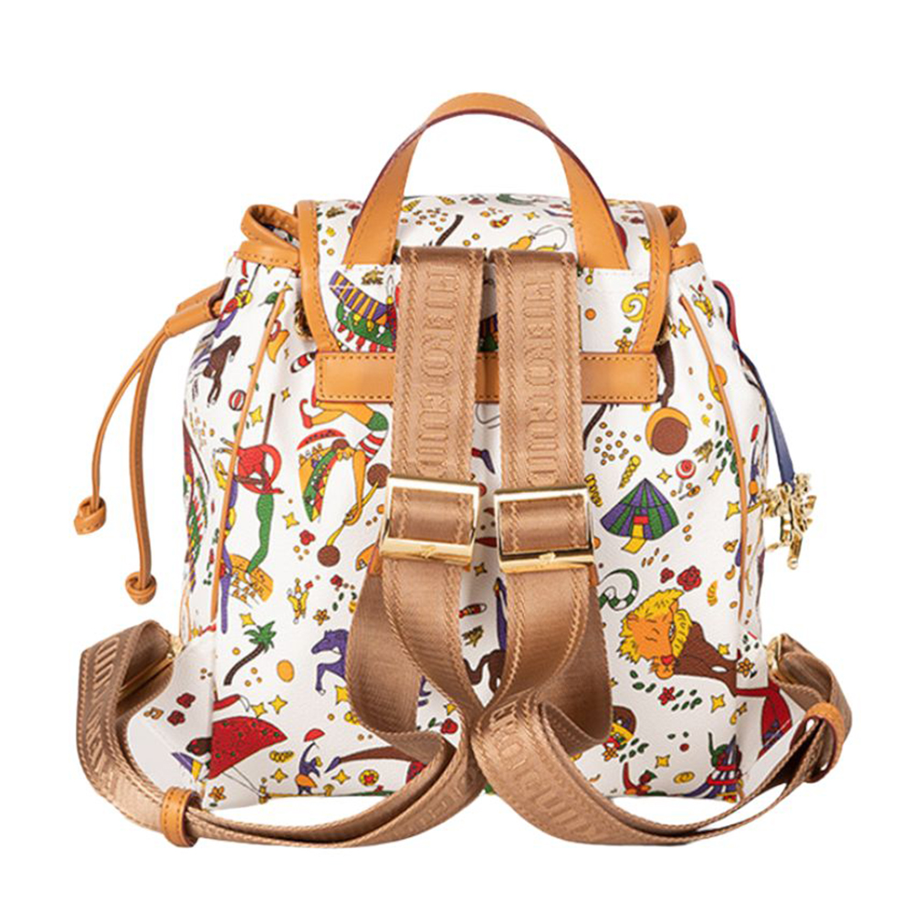 Lo zaino Alice di Piero Guidi realizzato in tessuto goffrato con stampa Magic Circus, finiture in metallo e riporti in cuoio. Pendente con logo, tasca frontale con zip, bretelle regolabili in gros-grain, manico in cuoio.