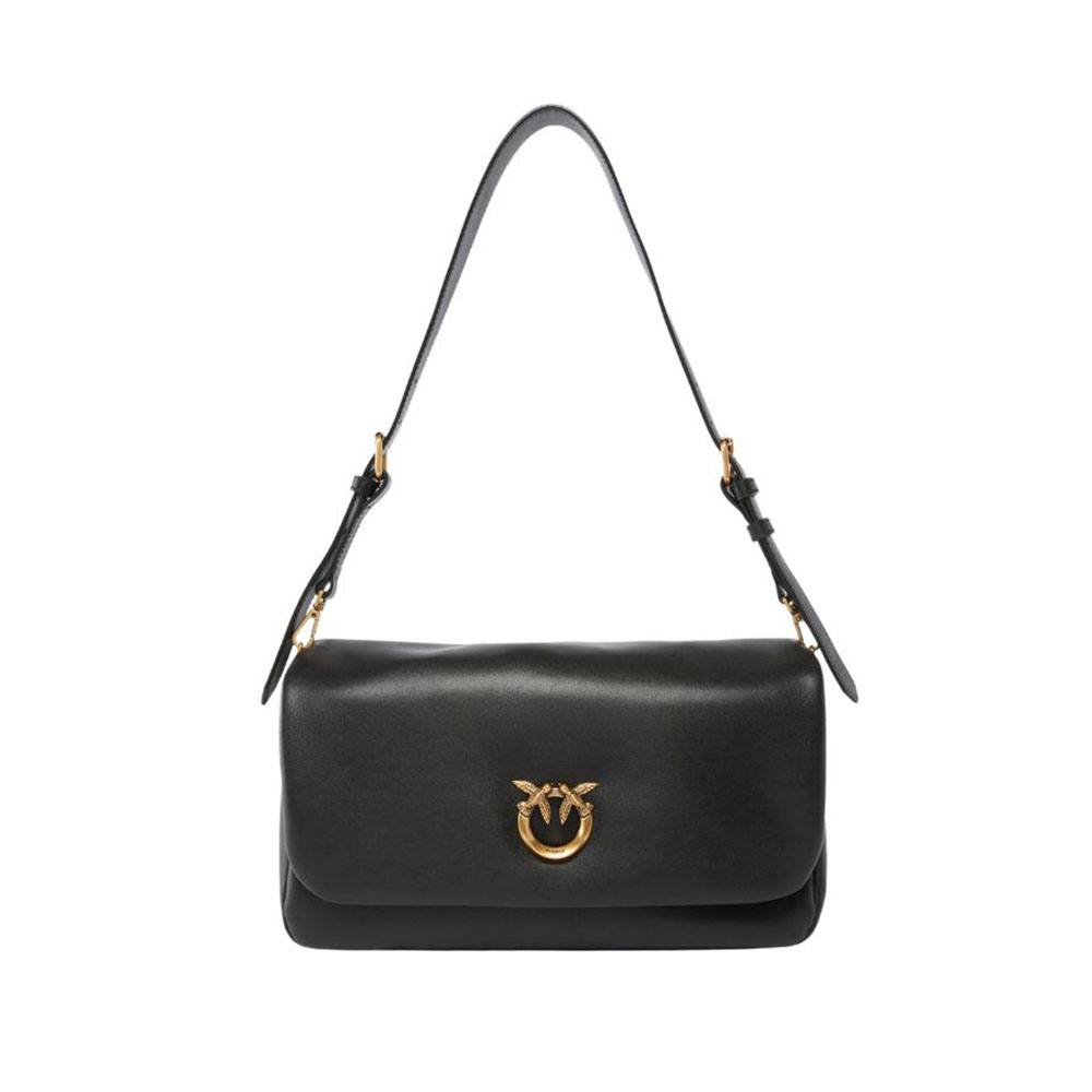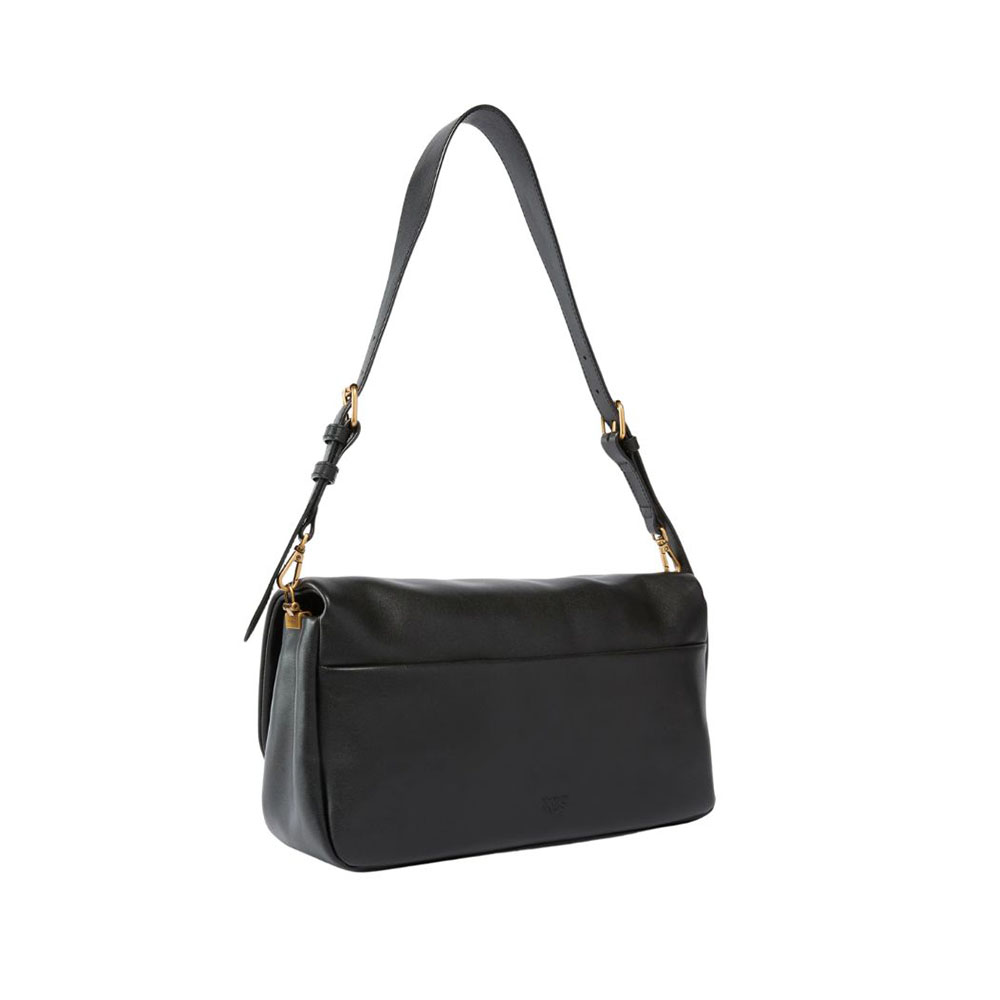 Borsa Pinko Love Bag Click Soft Horizontal Handle di medie dimensioni dalla forma rettangolare e allungata, realizzata in morbida pelle e leggermente imbottita. La borsa, personalizzata dall'iconico logo metallico Love Birds Diamond Cut sul davanti, può essere indossata crossbody o a spalla, grazie alla tracolla regolabile e rimovibile. La chiusura con due bottoni interni a calamita rivela un interno foderato in drill di cotone con una tramezza chiusa da cerniera e una tasca a parete completa di zip e targhetta logata.