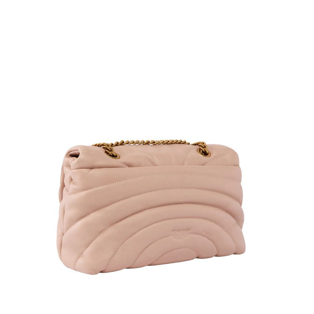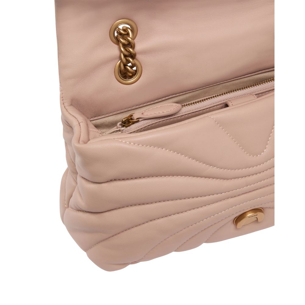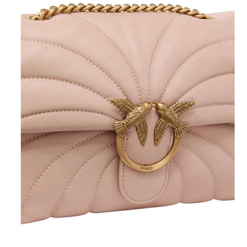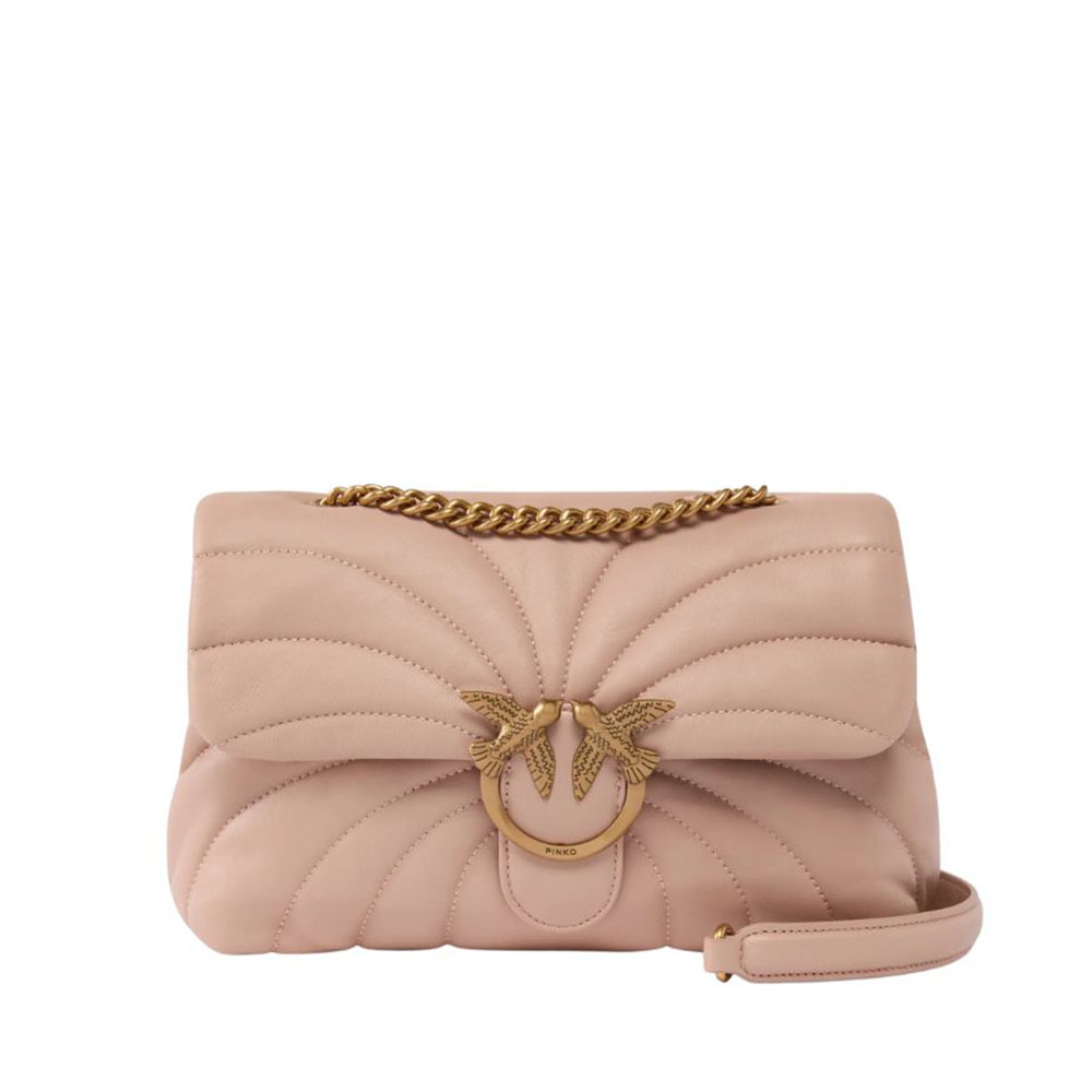 La borsa a tracolla grande Love Bag Puff di Pinko è realizzata in morbida nappa trapuntata con motivo Butterfly a farfalla. La chiusura della borsa è completata dalla fibbia in metallo, con logo uccellini Love Birds Diamond Cut. La tracolla scorrevole combina la classica catena metallica al pratico spallaccio in nappa, e può essere doppiato per indossare la borsa a spalla.