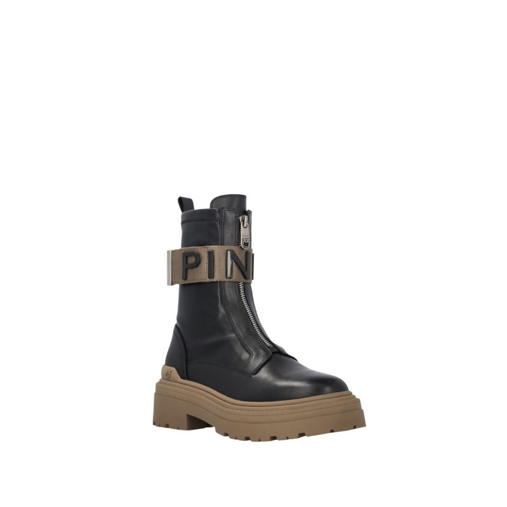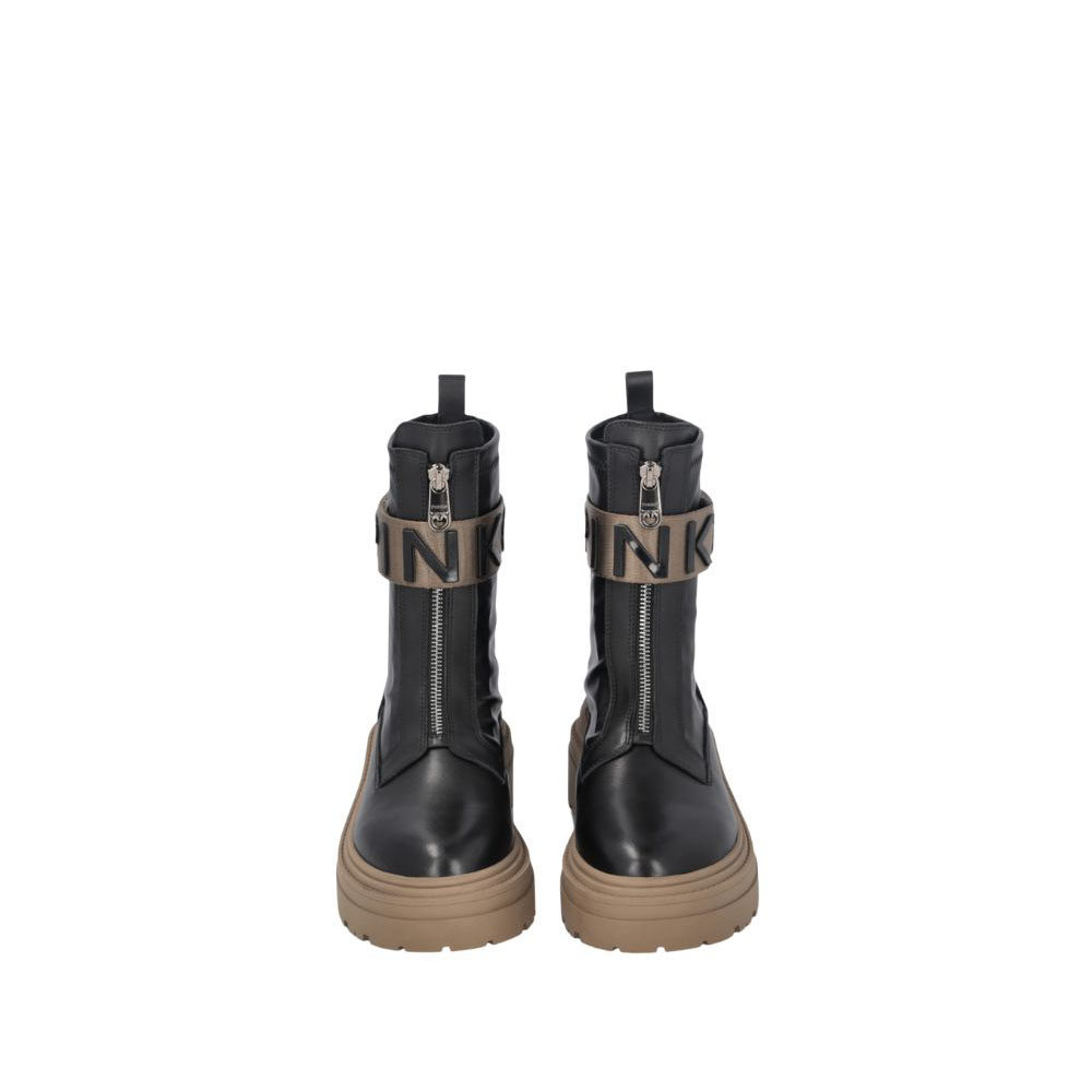 Stivali Mia 13 di Pinko alla caviglia in pelle con suola carrarmato platform in gomma, fodera in pelle, chiusura con zip sul davanti e tirante posteriore per facilitare la calzata. Il tocco finale è dato dalla fascia in nastro tecnico con logo lettering PINKO. Moderni e versatili, questi anfibi sono perfetti per un look casual e grintoso.