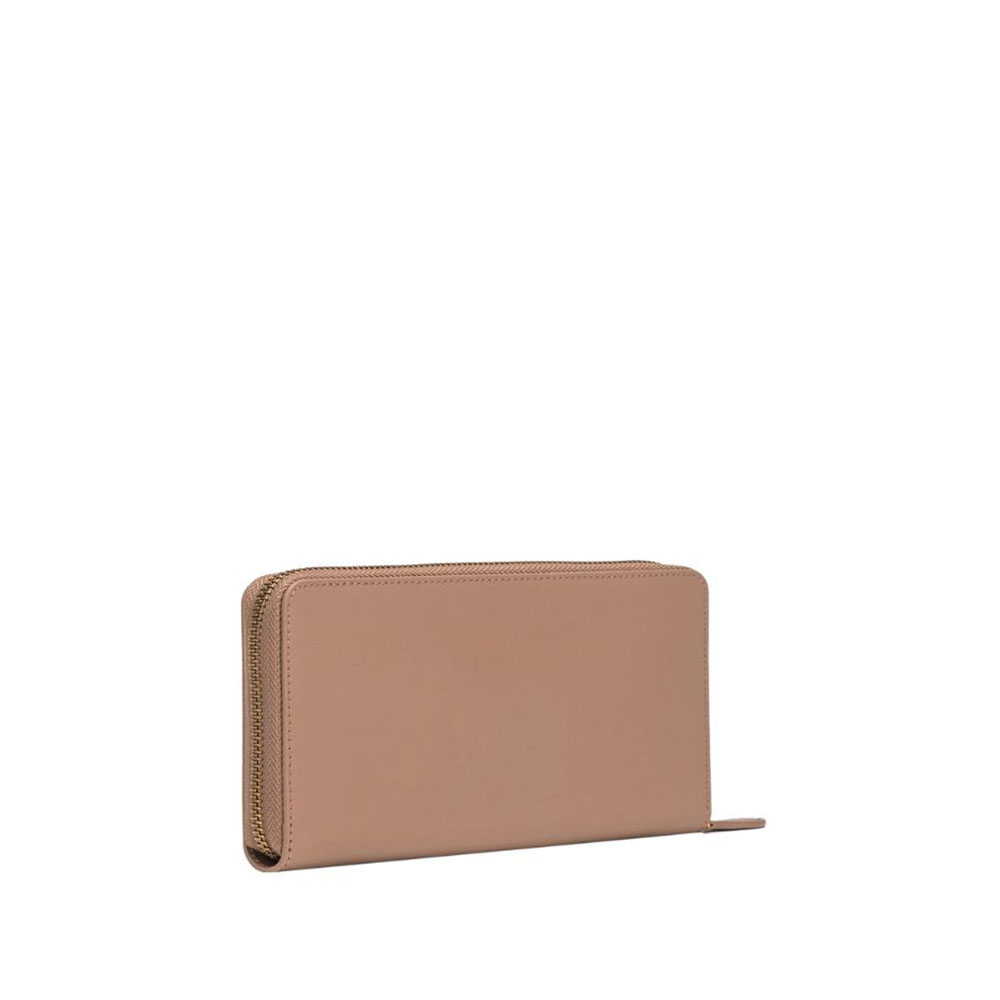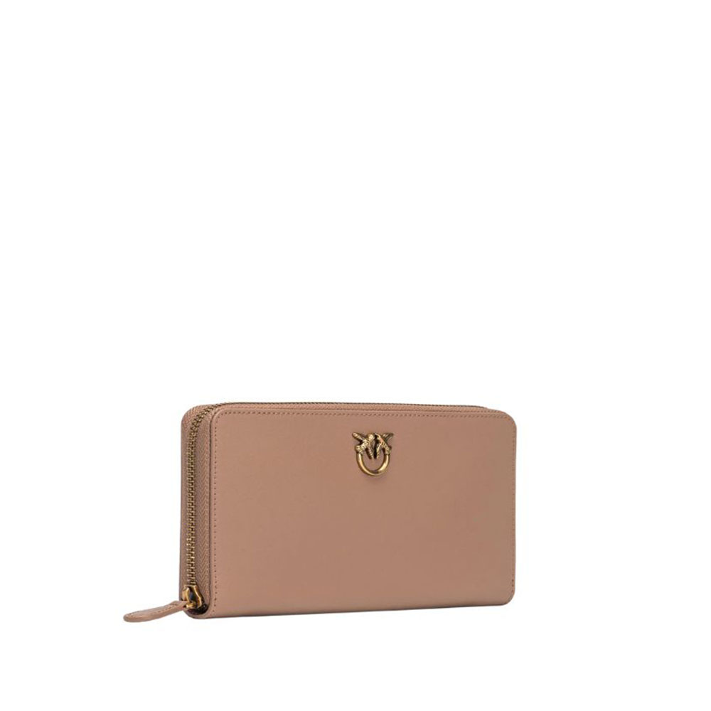 Portafoglio zip-around di Pinko in morbida pelle mano seta, personalizzato con placchetta Love Birds Diamond Cut su base in pelle. L'interno è foderato in polycotton ed è diviso in quattro scomparti, di cui uno chiuso con zip e due con spazi per carte di credito.