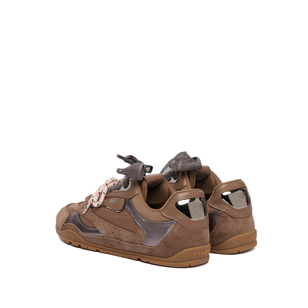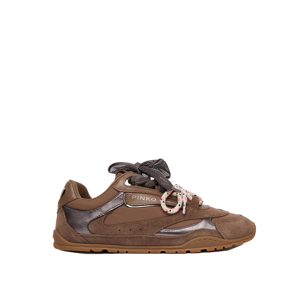 Scarpa da ginnastica di Pinko in tessuto tecnico con inserti in suede e pelle liscia, caratterizzata da doppi lacci: quelli superiori in rete e quelli inferiori con colorati dettagli grafici, per un raffinato contrasto materico e visivo. Il logo con gli iconici uccellini Love Birds spicca sulla linguetta, sul tallone dall'effetto specchiato e sotto forma di applicazione metallica dorata sui lacci, accompagnato da anelli metallici che compongono il logo lettering PINKO. I lacci superiori sono arricchiti da un brillante gioiello incastonato su una scarpa e da un charm dall'effetto marmorizzato sull'altra. Al suo interno, il modello presenta un fussbett da 10 mm in latex per unammortizzazione perfetta, mentre la comoda suola in gomma assicura grip. Reinterpretazione contemporanea di un classico del guardaroba sportivo, queste sneakers donano un tocco glam in puro stile PINKO a qualsiasi outfit casual.