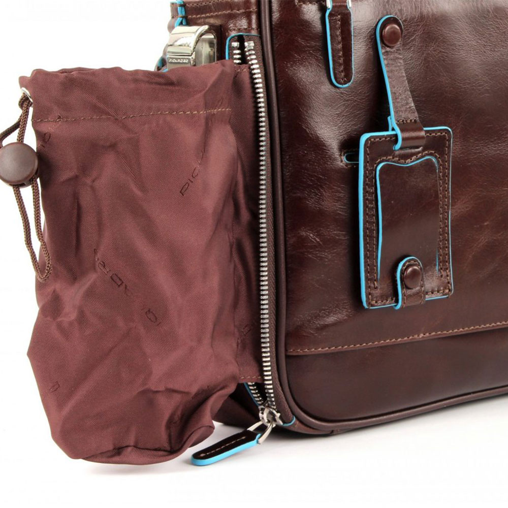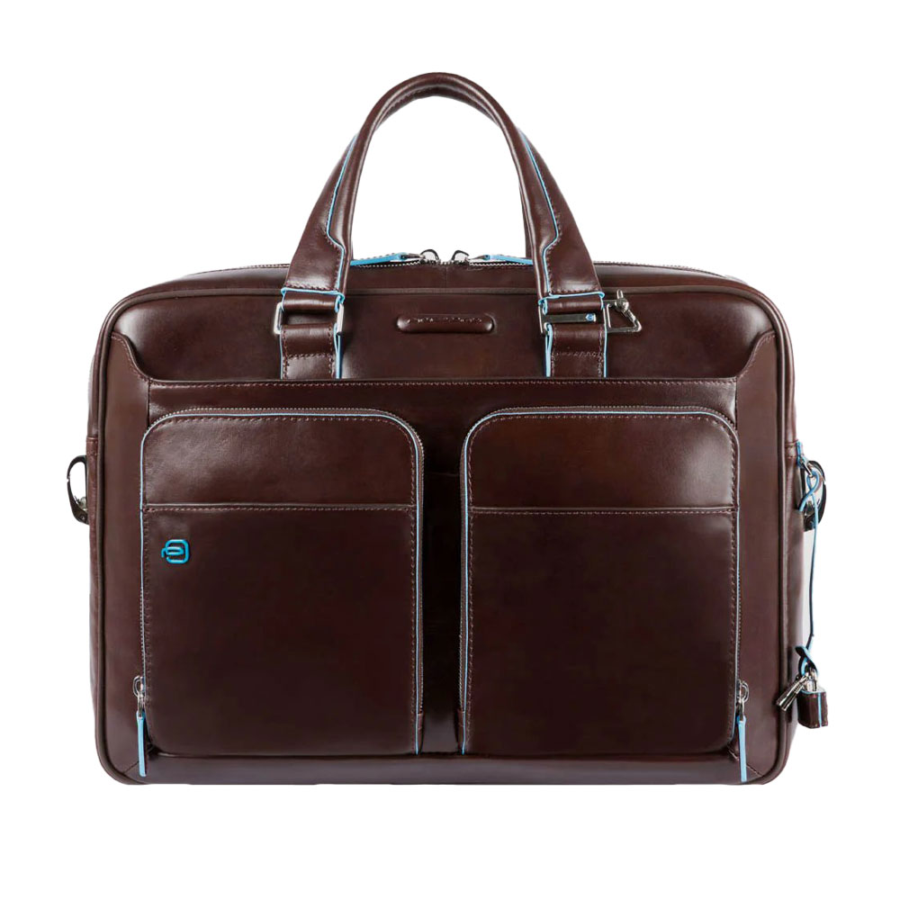 La cartella Blue Square sottile per computer di Piquadro ha due comode tasche frontali chiuse con zip, dove poter mettere tutto il necessaire e una tasca porta ombrello.