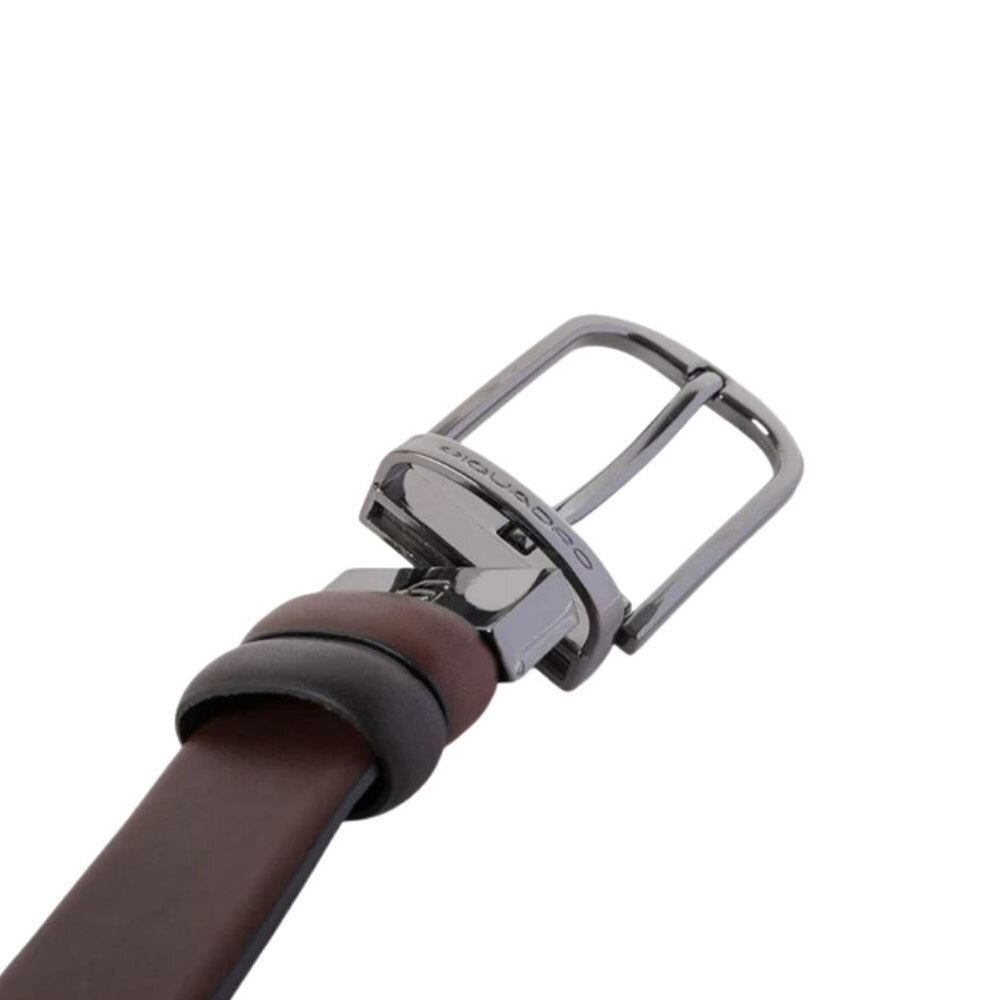 Cintura uomo di Piquadro reversibile con fibbia ad ardiglione. Da un lato la cinta è di colore nero e dall'altro è blu.