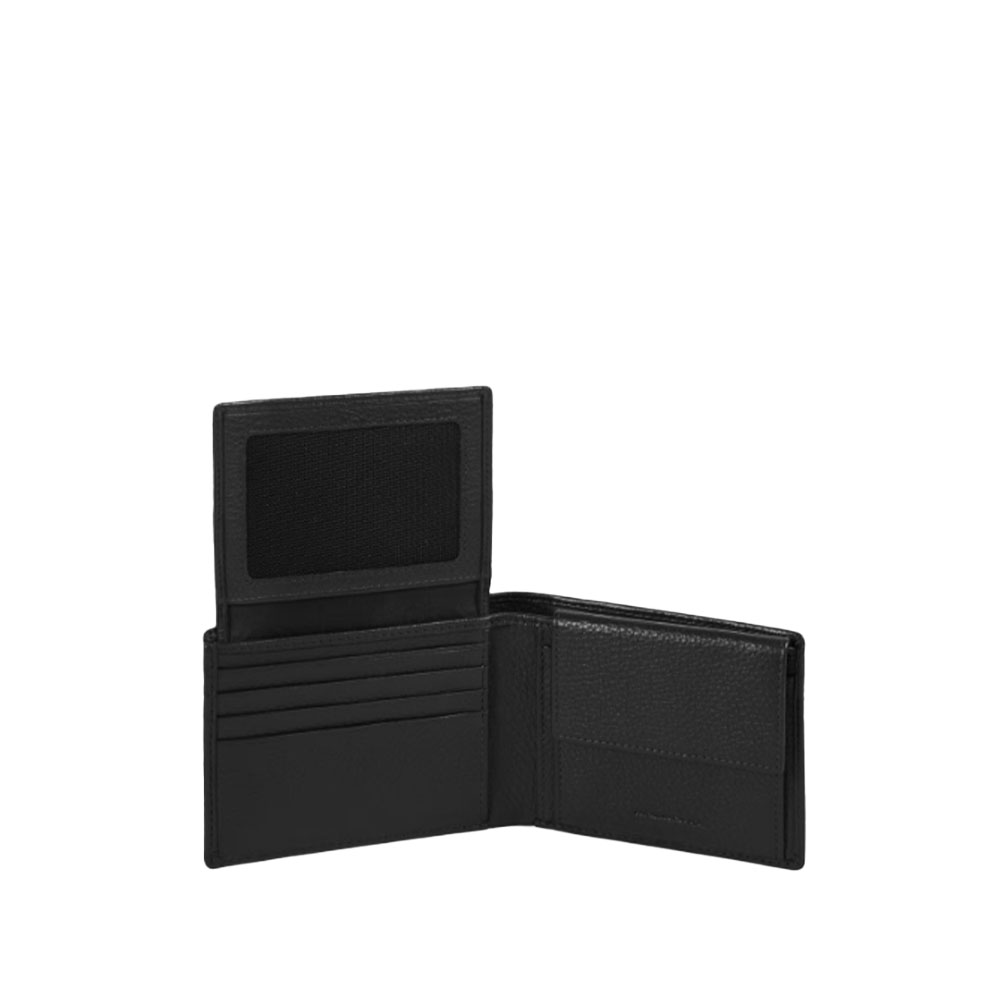 Portafoglio uomo di Piquadro in pelle con flap portadocumenti e portamonete chiuso con bottone.
