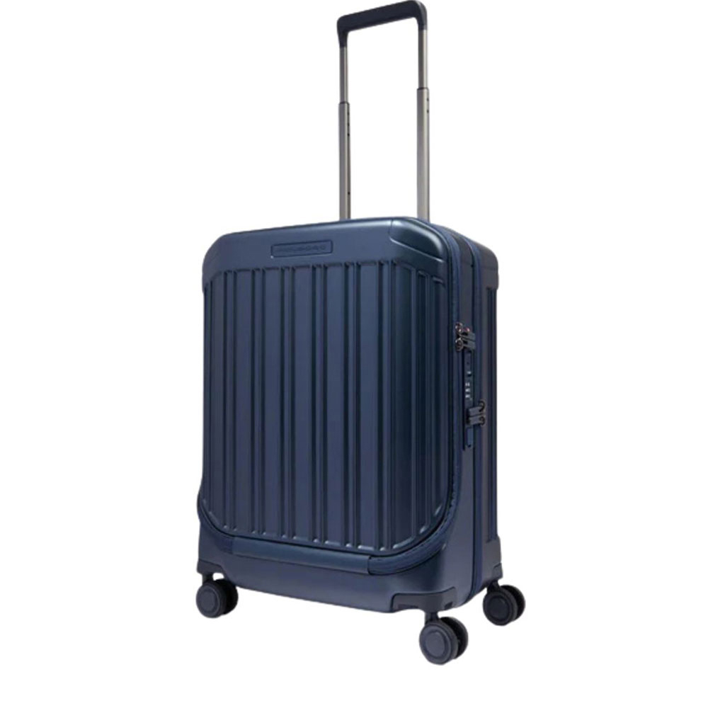 Trolley da cabina di Piquadro a 4 ruote con tasca frontale antiurto per computer e iPadPro, porte USB e USB Type C e fodera lavabile rimovibile.