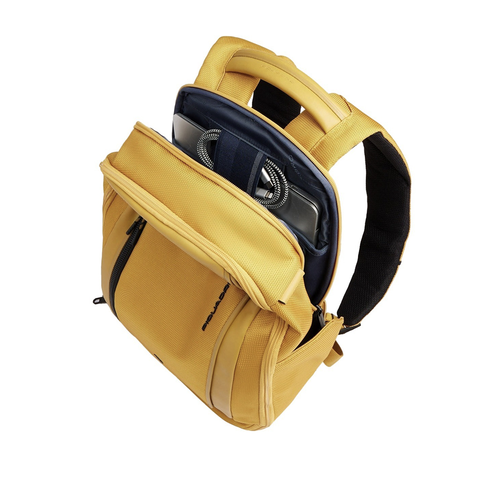 Zaino da viaggio porta pc e iPad di Piquadro in tessuto riciclato con porte USB e USB Type C, tasca per AirPods, porta occhiali, protezioni antiurto e RFID.