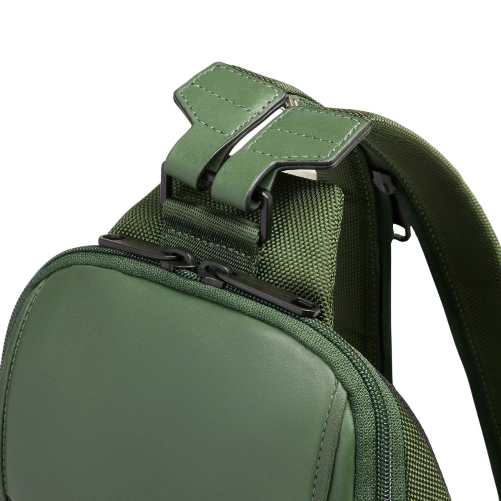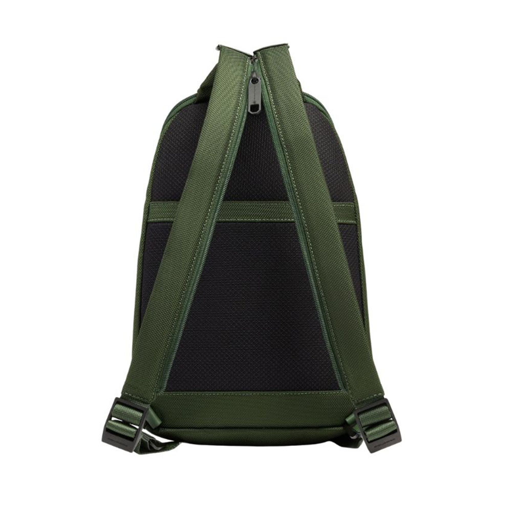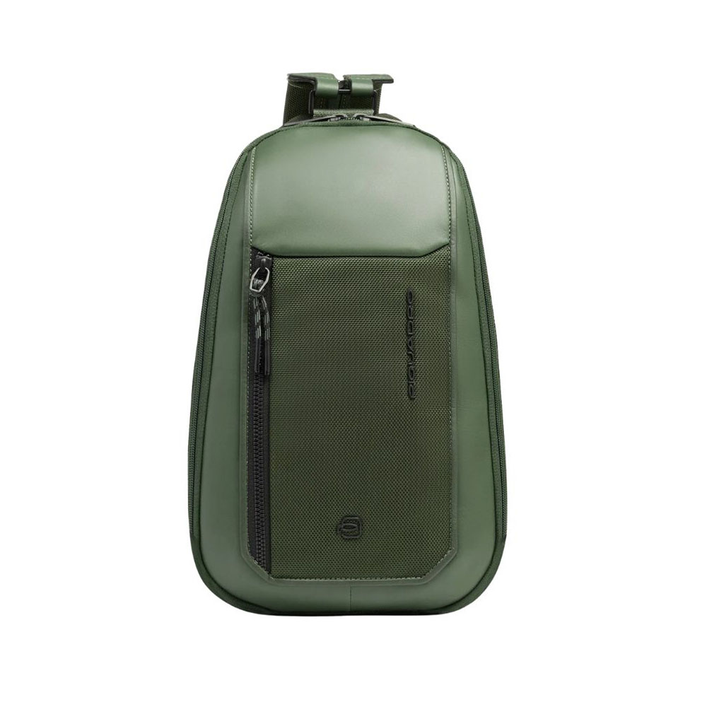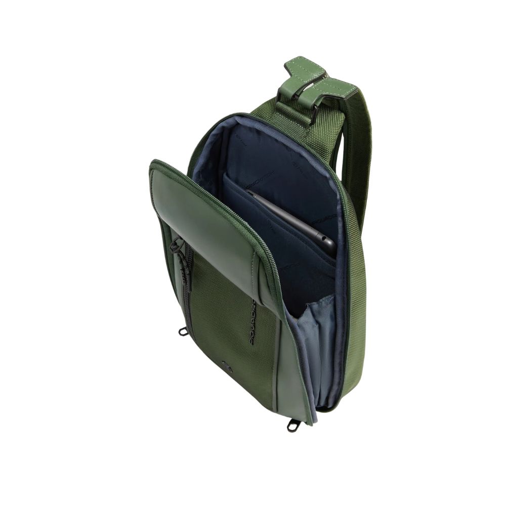 Zaino monospalla uomo di Piquadro porta iPad in tessuto riciclato e pelle con protezione RFID e tasca per AirPods.