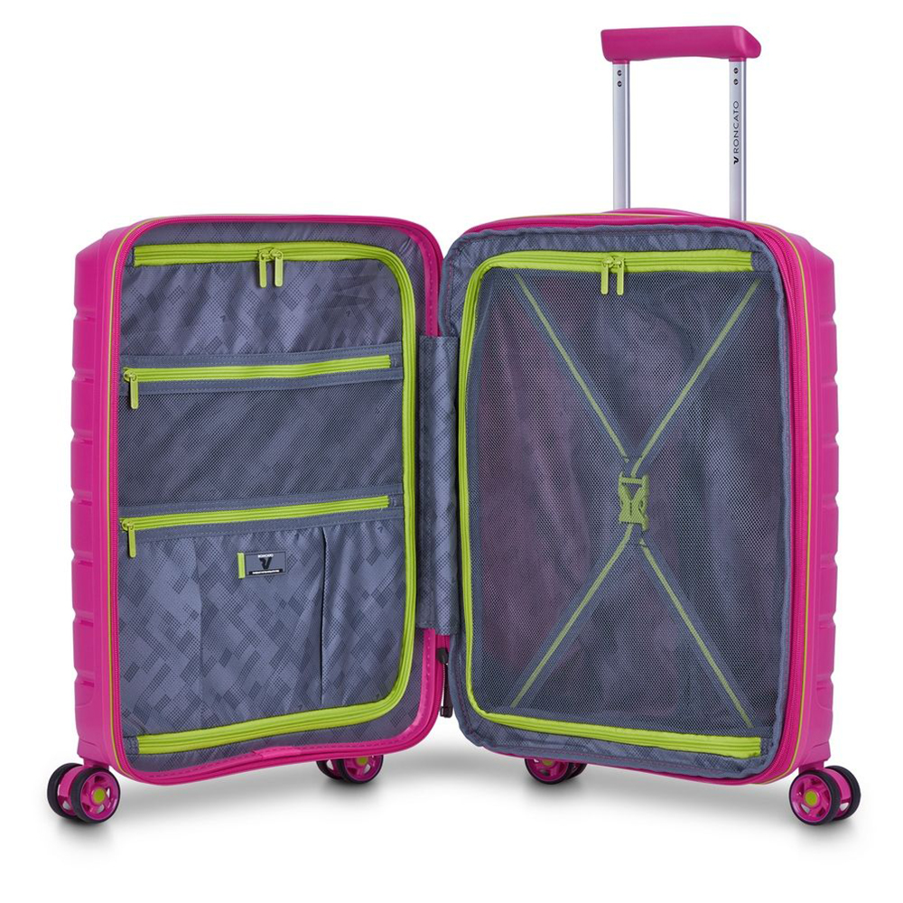 Il trolley da cabina B-flying di Roncato è stato interamente progettato in Italia ed è adatto a soddisfare le esigenze dei viaggiatori. Lorganizzazione interna permette di organizzare al meglio ogni cosa grazie a elastici per bloccare i vestiti, divisori e comparti dedicati. Le ruote sono doppie, per una maggiore stabilità e presentano un design colorato ed accattivante. Il trolley è dotato di lucchetto a tripla combinazione TSA per i viaggi negli Stati Uniti. B-flying è una linea adatta a tutte le esigenze di spostamento, dal carattere giovane e allo stesso tempo funzionale grazie allintegrazione del sistema di ricarica tramite USB.