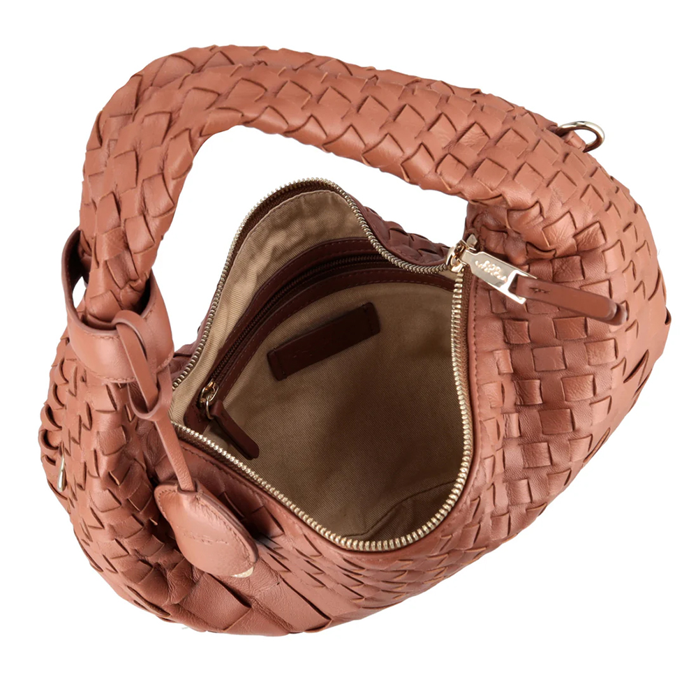 Eleganza in miniatura per la borsa a mano mini Milano di Tosca Blu, proposta nel luminoso colore cuoio. Realizzata in pelle, si distingue per la lavorazione intrecciata che dona movimento e carattere al design. La chiusura con lampo custodisce un unico scomparto, mentre la tracolla removibile e il manico intrecciato offrono versatilità. Completa il modello la targhetta con logo in metallo. Questa borsa a mano mini è un mix irresistibile di classe e grinta, l'accessorio da sfoggiare a più non posso.