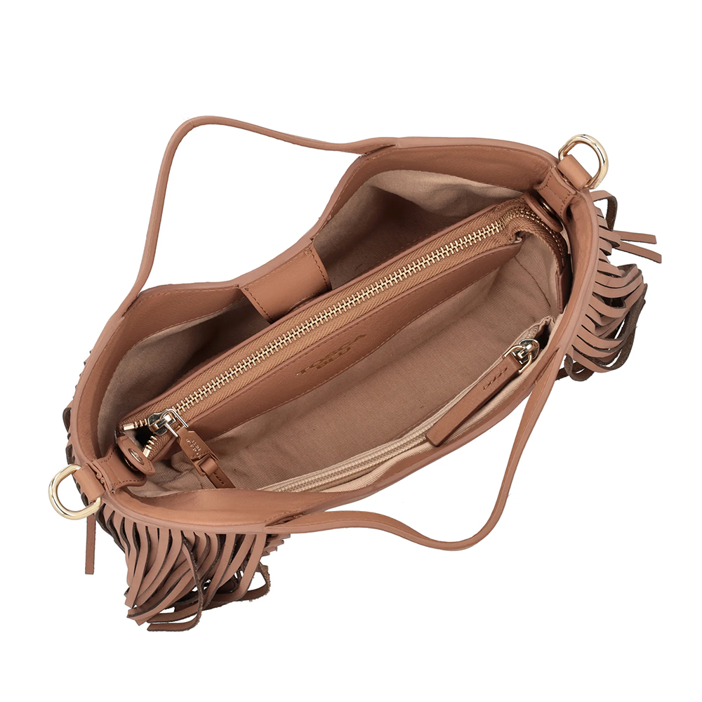 Compatta e ricercata borsa a mano Portofino in pelle firmata Tosca Blu. Le frange laterali incorniciano la silhouette con un movimento leggero e sofisticato. Il manico strutturato valorizza la linea e consente di indossare il modello con eleganza. La presenza della tracolla offre versatilità nelle occasioni più dinamiche. Questa borsa a mano in pelle è pensata per accompagnarti con personalità sia negli impegni quotidiani sia nei momenti speciali anche grazie ai tre comodi scomparti interni.